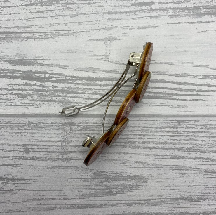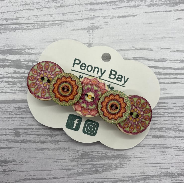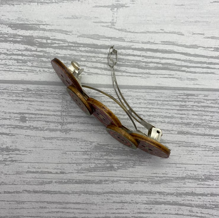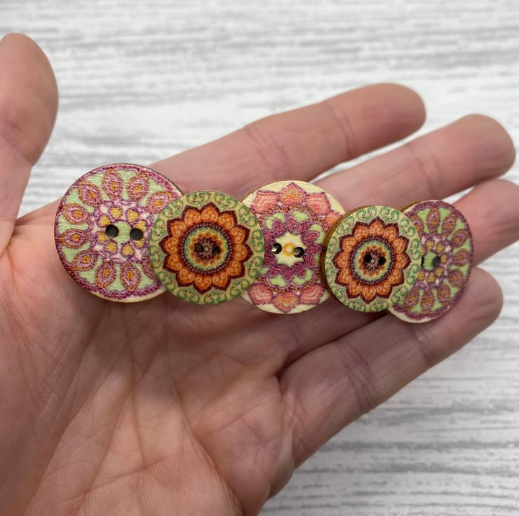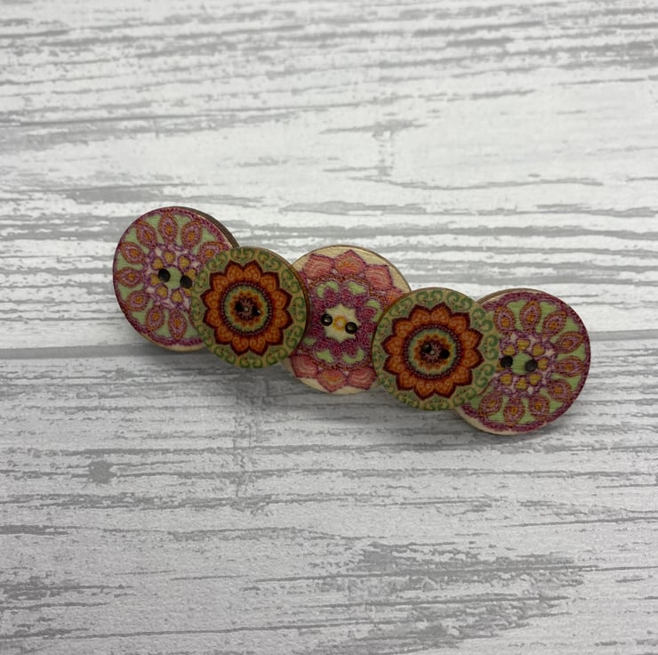 This barrette is made with five buttons, with mandalas in three designs. There are three larger buttons on the bottom row, the end buttons are matching with a different design in the centre. Then there are two smaller buttons on the top row, these have the same design.