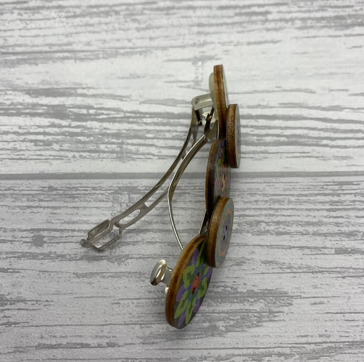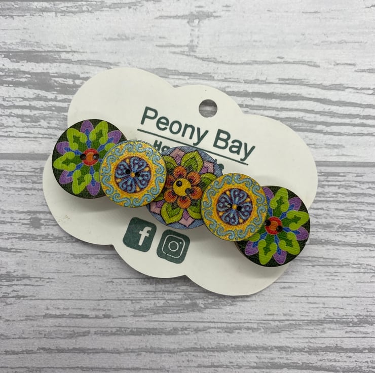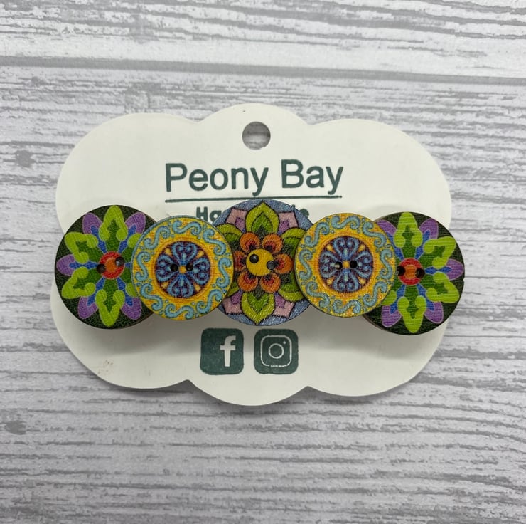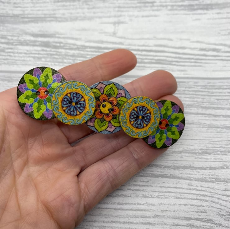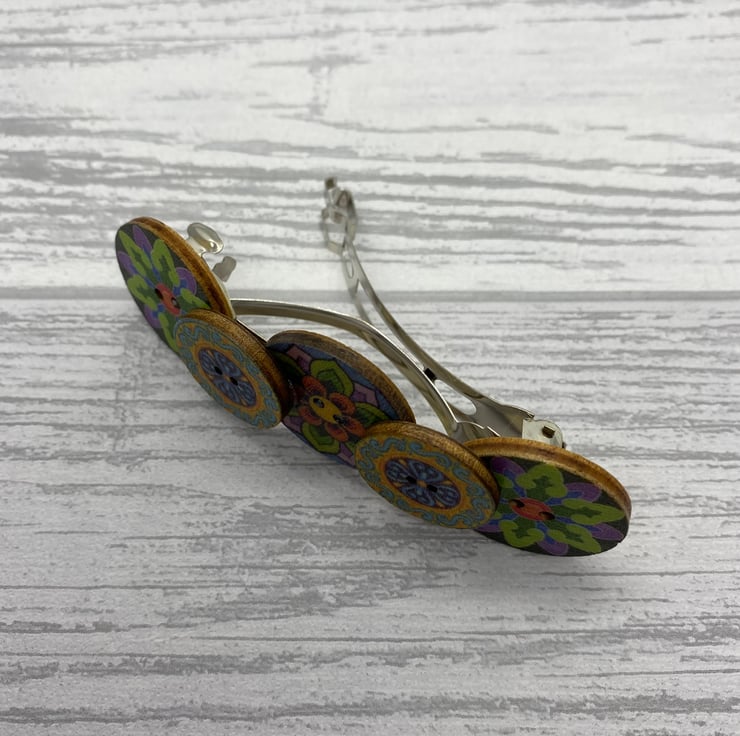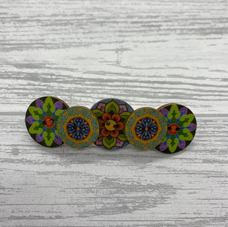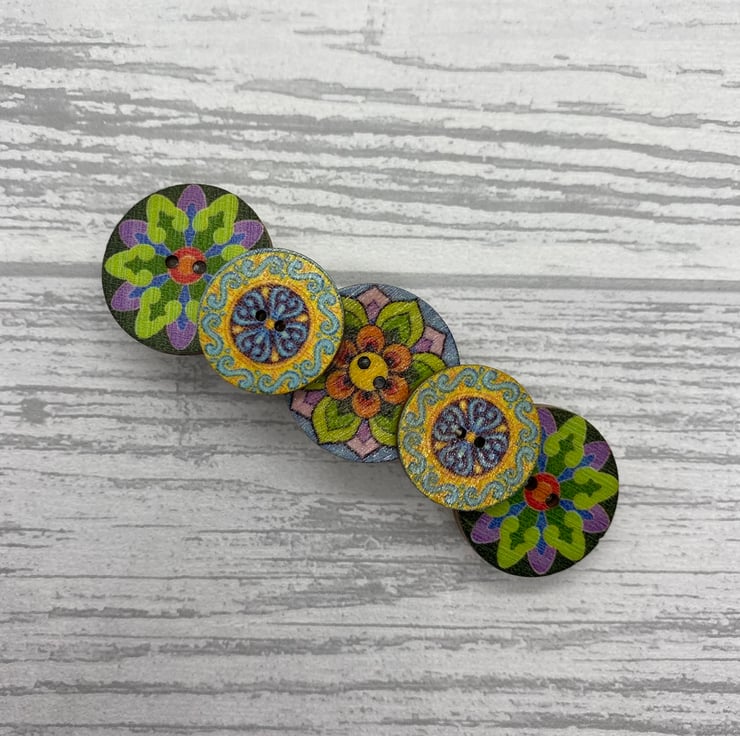 This barrette has five buttons with floral and mandala designs. There are three larger buttons on the bottom row, the buttons on the end are matching, with a different design on the centre button. Then there are two smaller matching buttons on the top row.