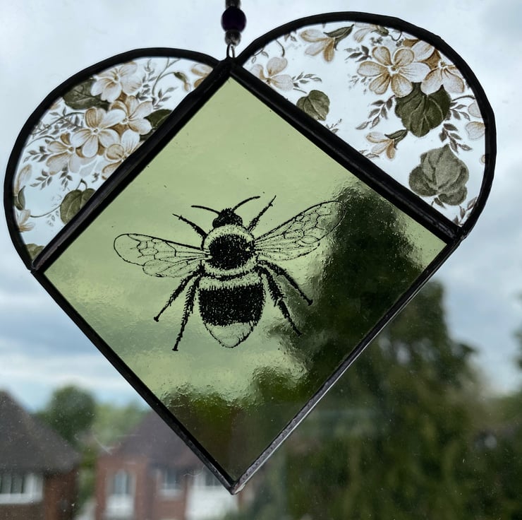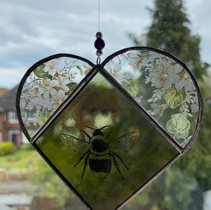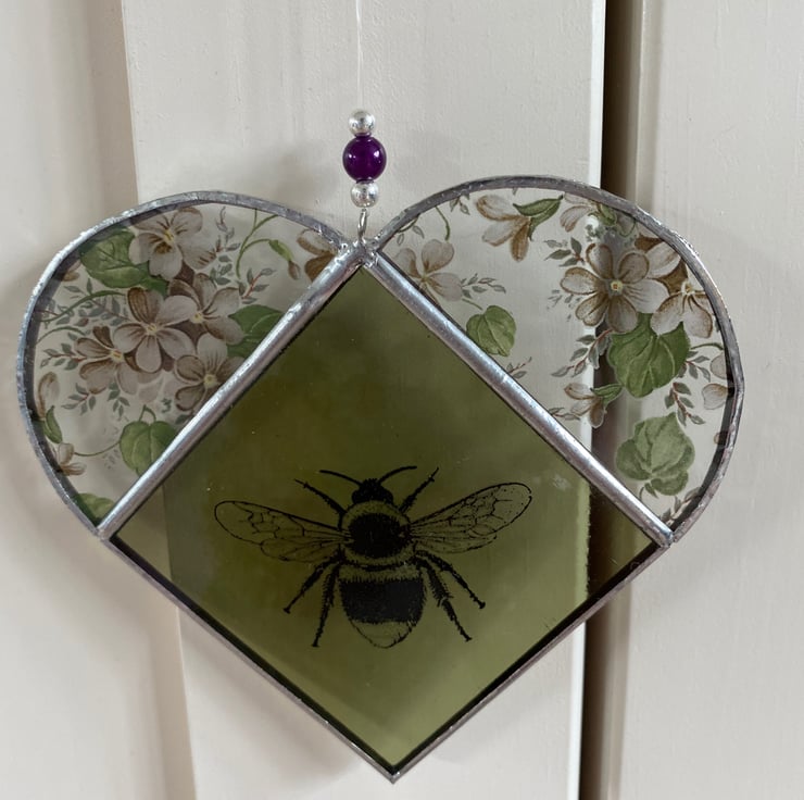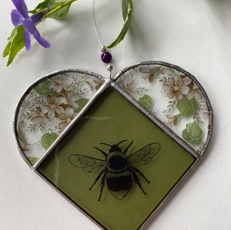 A beautiful 2 tone stained glass heart made using the Tiffany ( copper foiled ) method of stained glass . The main body is a moss green and the tops a beautiful purple violet flowery glass .The heart has an image of a bee which has been screen printed on in black enamel and then fired.