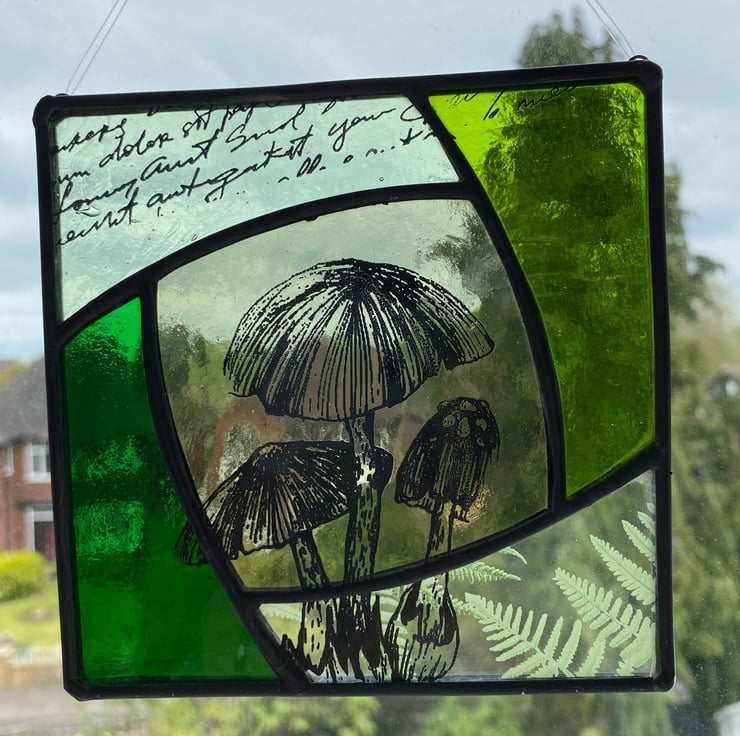 A beautiful 5 piece panel made using the Tiffany (copper foiled) method of stained glass. The panel is comprised of 5 angled pieces of glass in shades of green one with a fern design. It has fungi and text screen printed in black enamel before firing in the kiln. The lead came edge has been patinated to give a black antique finish, and it has a clear nylon hanging thread.