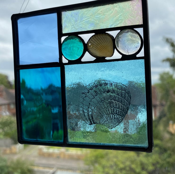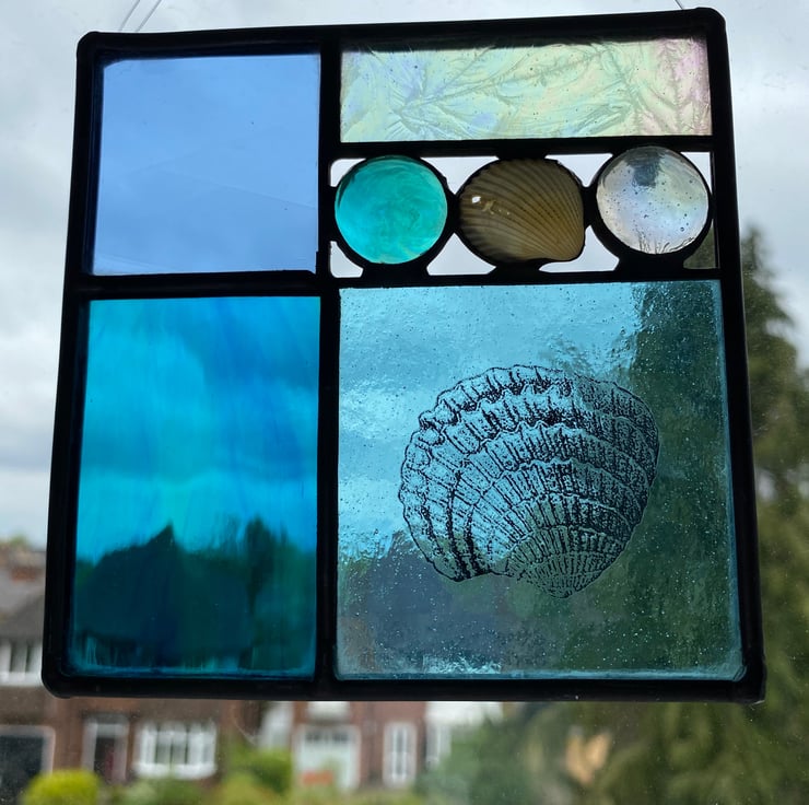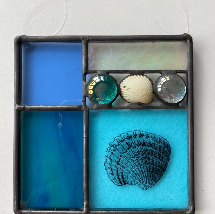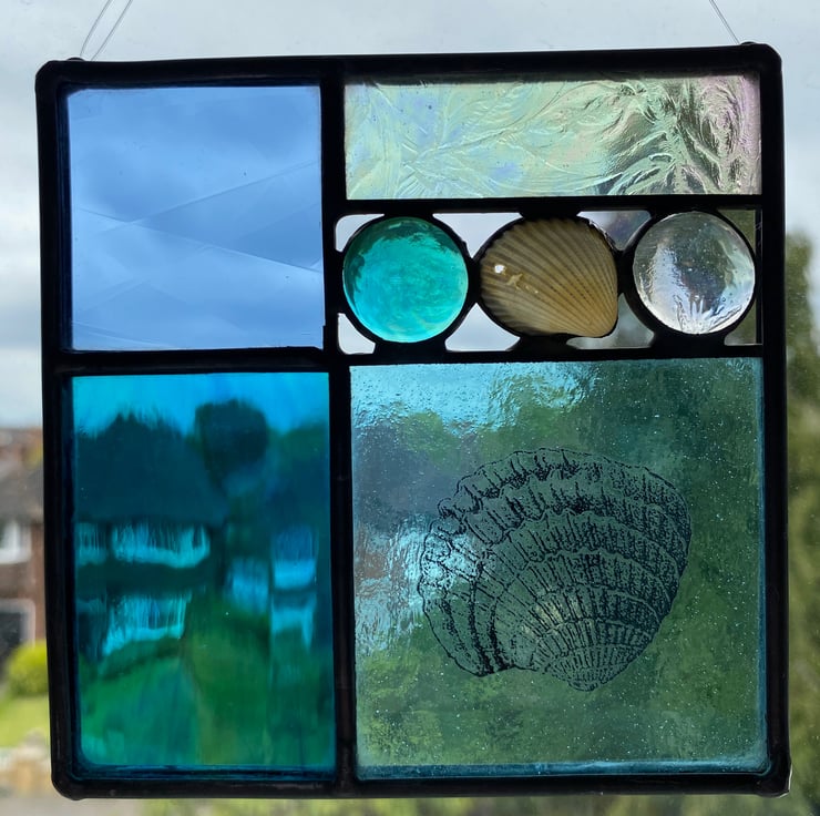 A beautiful 4 piece panel made using the Tiffany (copper foiled) method of stained glass. The panel is comprised of 4 pieces of glass in pale blue, aqua ,turquoise and iridescent clear. It has a shell screen printed in black enamel before firing in the kiln and two glass nuggets and a shell. The lead came edge has been patinated to give a black antique finish, and it has a clear nylon hanging thread.