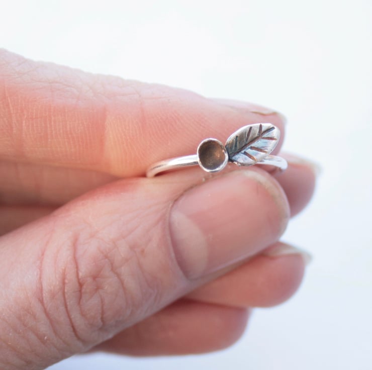 This handmade silver ring has been inspired by nature. I have created a small domed silver disc and a hand cut leaf and these have been darkened with a patina which enhances the design of the ring.