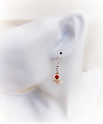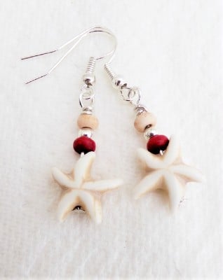 Summer earrings featuring semi-precious gemstone howlite star fish with semi-precious gemstone howlite small rondels in red and cream. The earrings have silver plated ear hooks which are for pierced ears only.