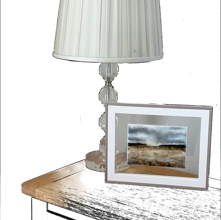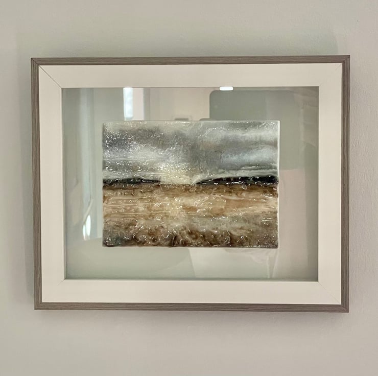 A stunning dramatic wet sky seascape fused glass art, framed on clear glass in a coordinated grey tones frame. The piece is created layering glass powders to create the colour and texture of the sea and sky. The clear glass frame means that you can see through the piece. Choose to either to hang on the wall, where you’ll see the wall behind or stand on a stable surface (where it won’t be knocked over).