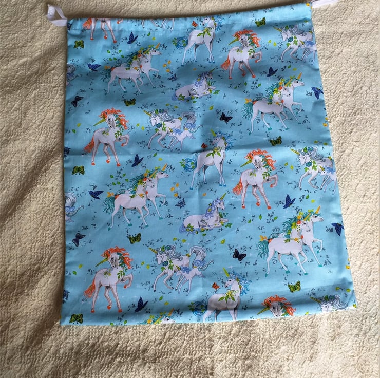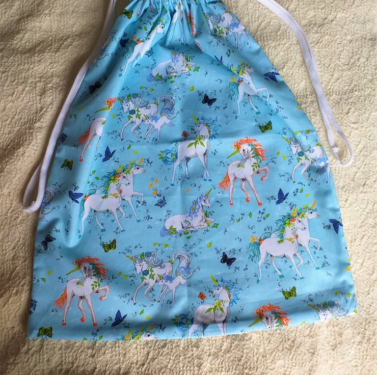 This washable cotton drawstring bag is 17.5" long and 14.5" wide.