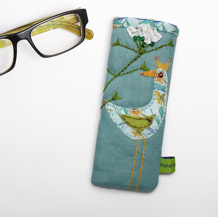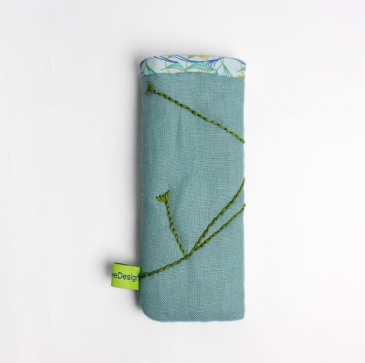 I have made the glasses case from turquoise linen fabric and hand embroidered a bird and a shepherd's purse flower onto it with beaded details. It is lined with an up-cycled vintage silk scarf and trimmed with my own cotton aqua marigold print. The glasses case is wadded to protect your glasses. The item measures 17.5cms(7 inches) by 7.5cms(3 inches).