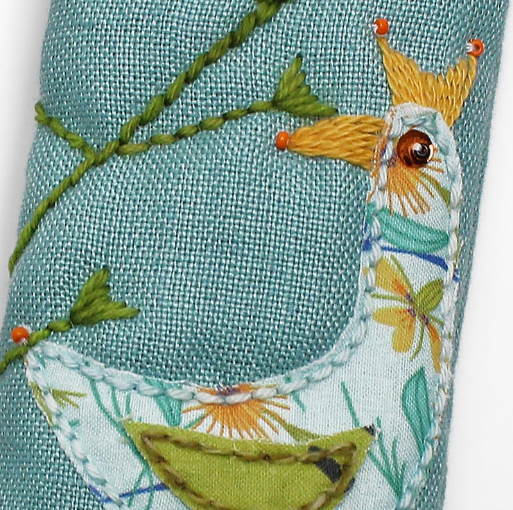 The bird embroidery is inspired by a Scandinavian ceramic from the mid-century era.