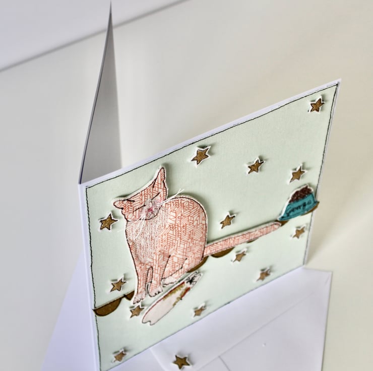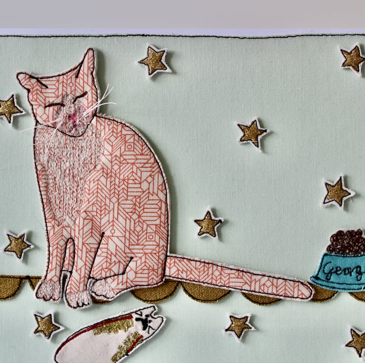 This card has been sewn by me and my sewing machine, using cotton cloth and metallic fabric; making it totally unique.