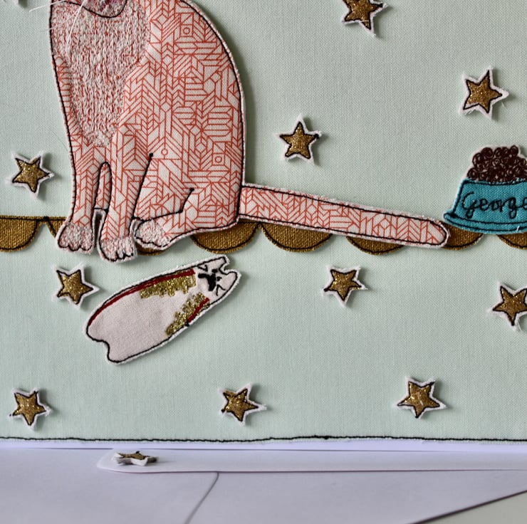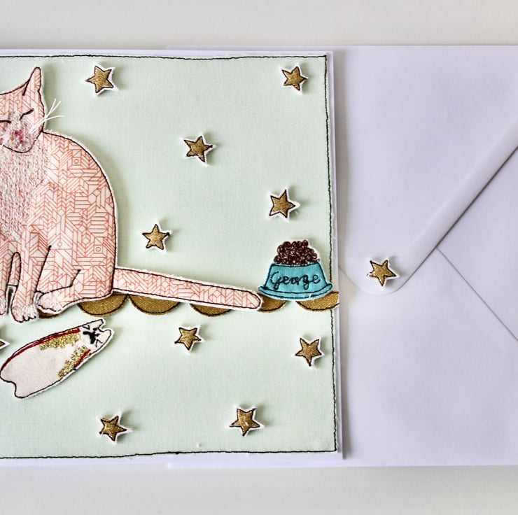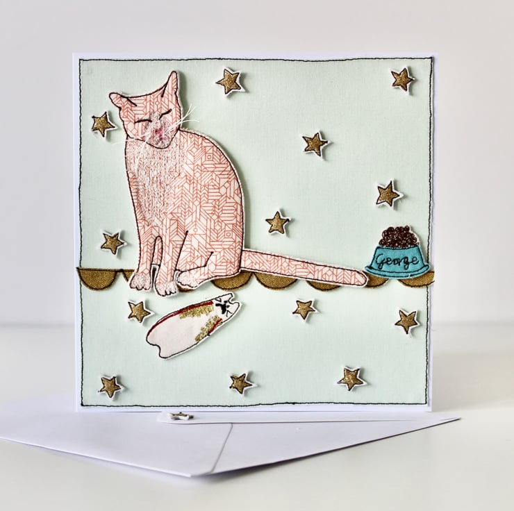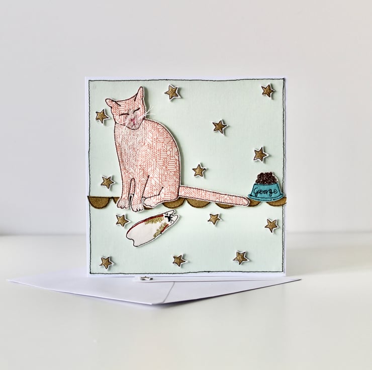 A celebratory card which includes George, a bowl of cat treats, a cat toy and stars,