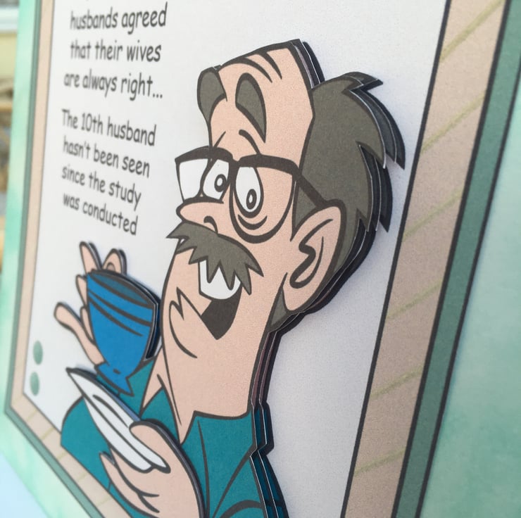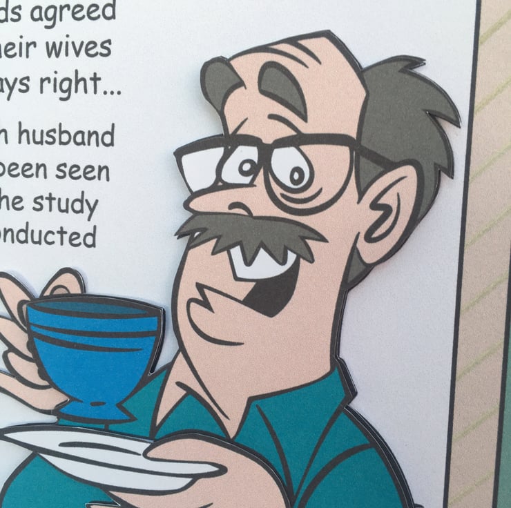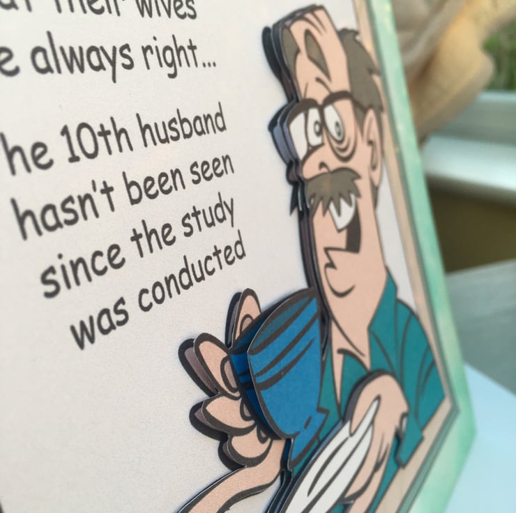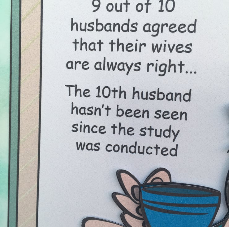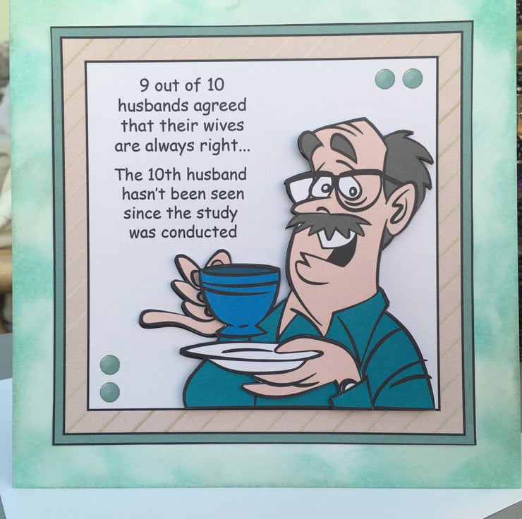 This comic and funny card is just right for an anniversary or birthday for the ‘hen pecked’ husband! An 8x8in card that’s just a bit of fun. The main image shows a gentleman drinking some tea. The caption relays a fictitious study about men agreeing with their wives, the one who didn’t was never seen again! It will bring a smile to any face. The image is layered giving the card dimension. This design can be repeated if you want other copies.