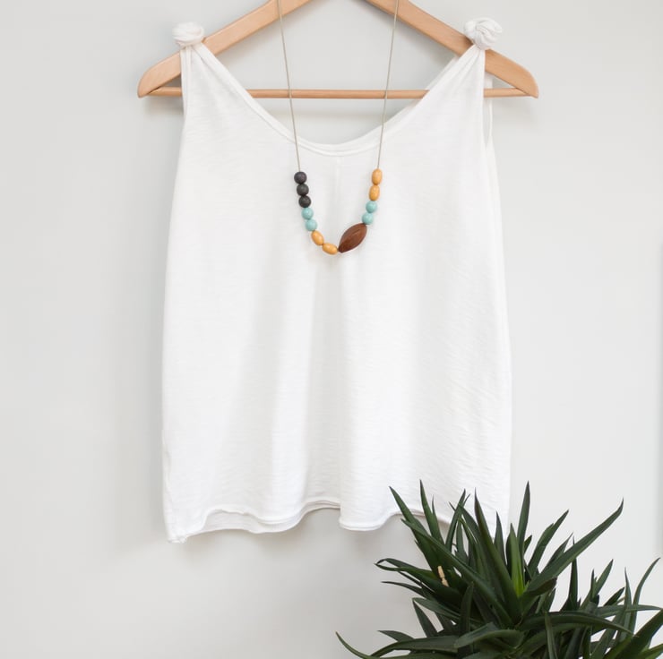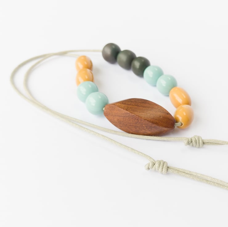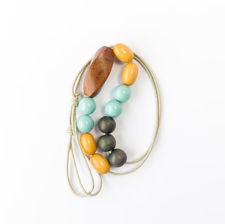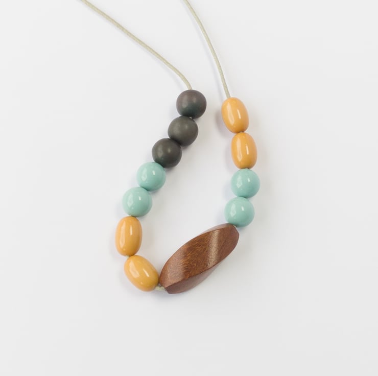 Ada is made up of 11 repurposed small ceramic beads and one larger vintage wooden bead. The colours ochre, light blue and dark grey work well together creating a simple light weight necklace for day or evening wear. The necklace can be made to any length between 41cm and 26cm using the sliding knots.