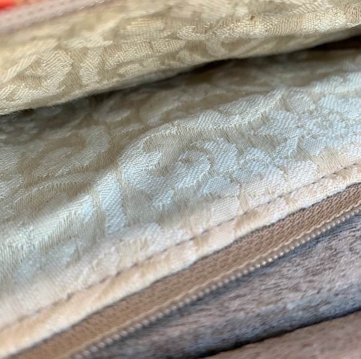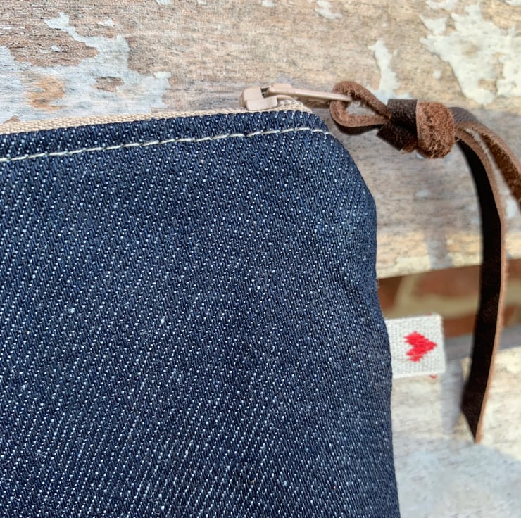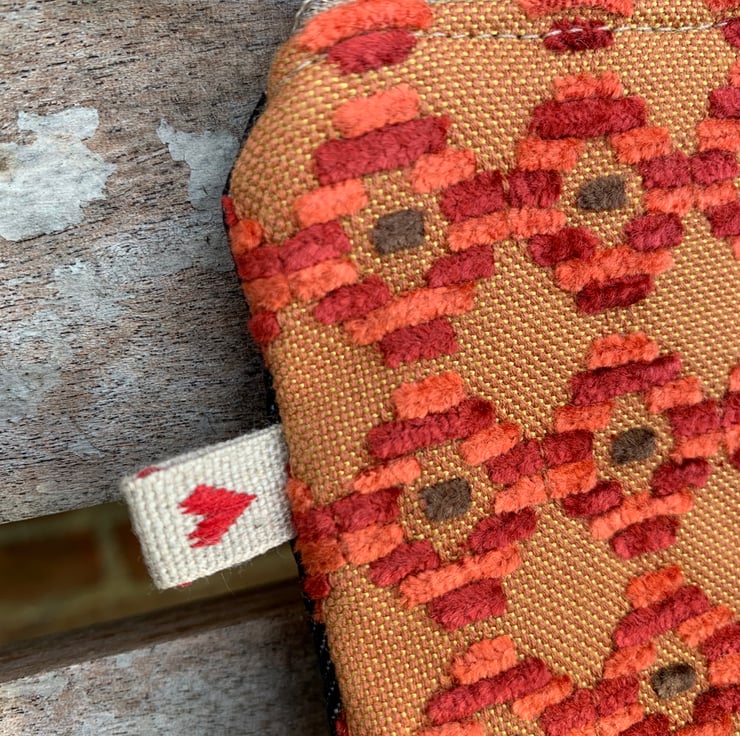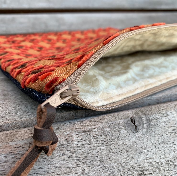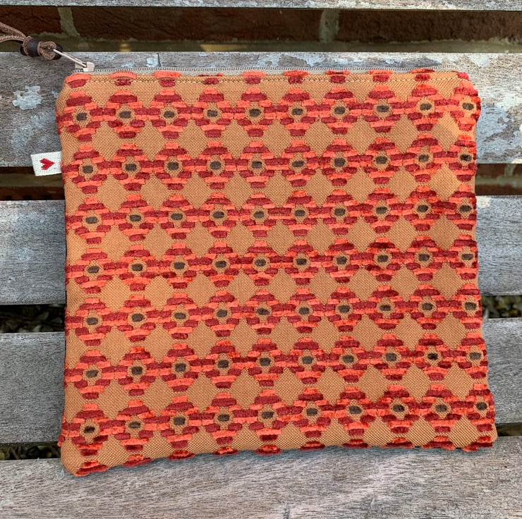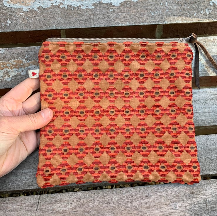 One of a kind zip pouch in Osborne and Little fabric with a textured geometric pattern of raised chenille in red, brown and orange. The pouch is backed with a thick dark denim and lined in reclaimed cream fabric. Waste leather from a local upholsterer forms the zip pull.