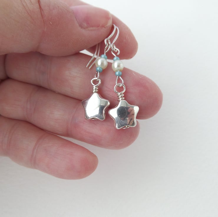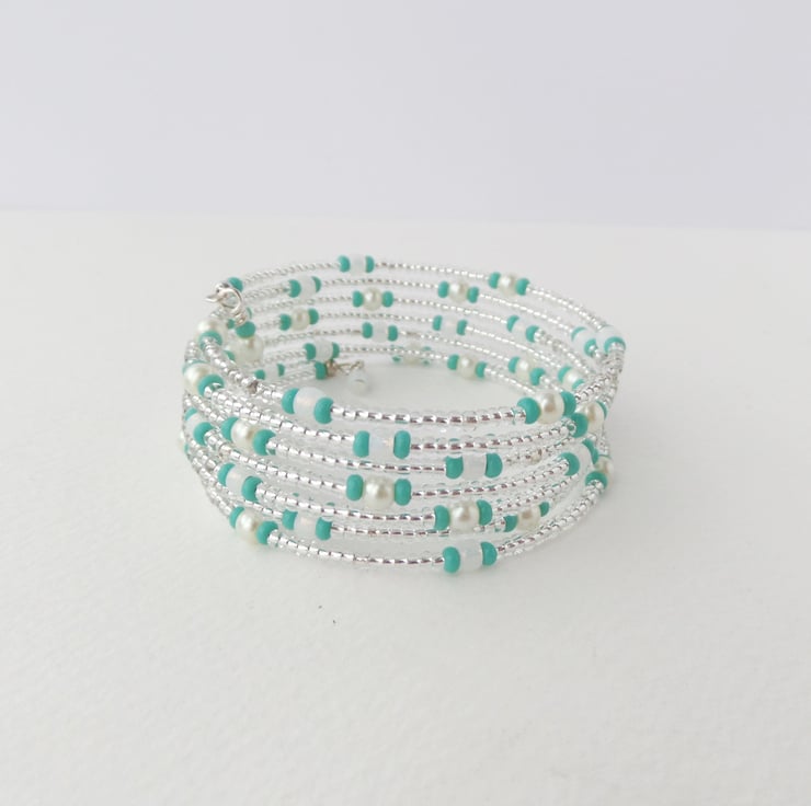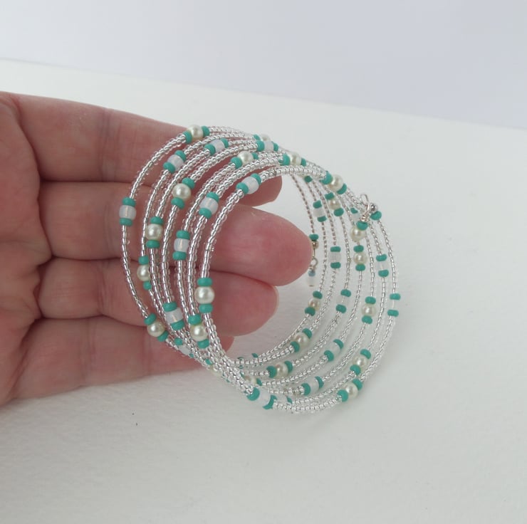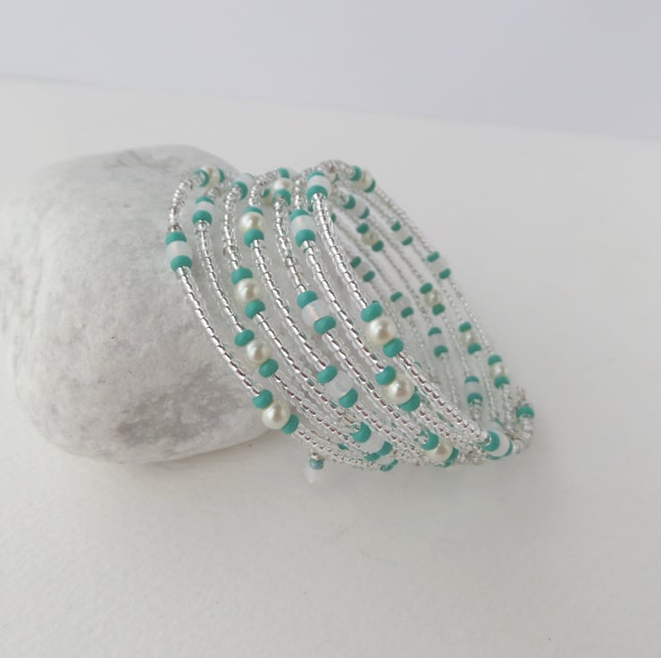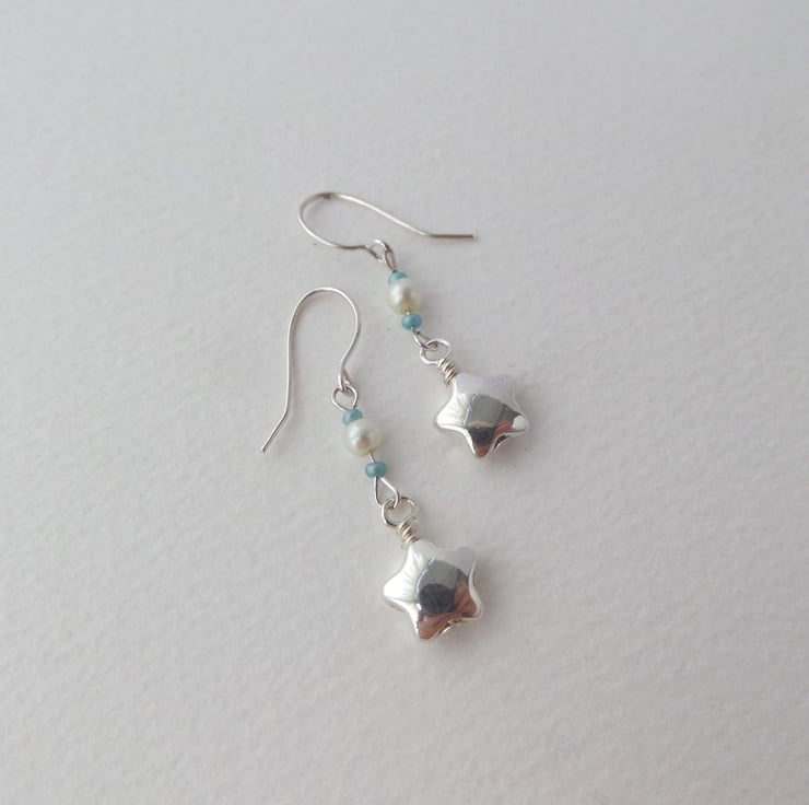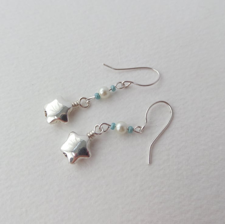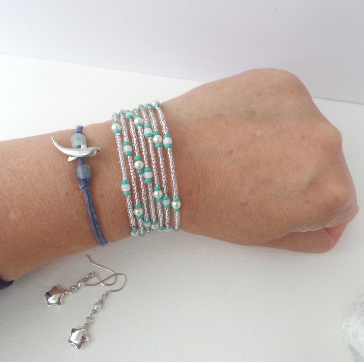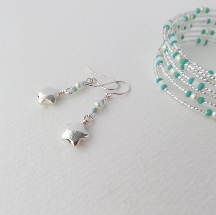 A shiny puffed star on these cute earrings, with coordinating memory wire beaded bangle. In pearls and mint green/turquoise green beads.