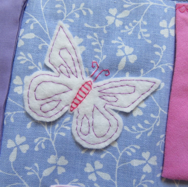Applique felt butterfly motif with hand-embroidered details.