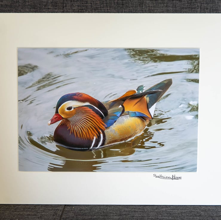 This photo is of a Mandarin Duck which I came across whilst on a visit to Osterley Park in 2014. I love the stunning colours of its plumage and the ripples in the water. The photo is mounted in a 1.4mm smooth ultra-bright white mount with internal bevel cut and straight outside edges and is hand-signed by myself (Sue Vaizey-Moore)