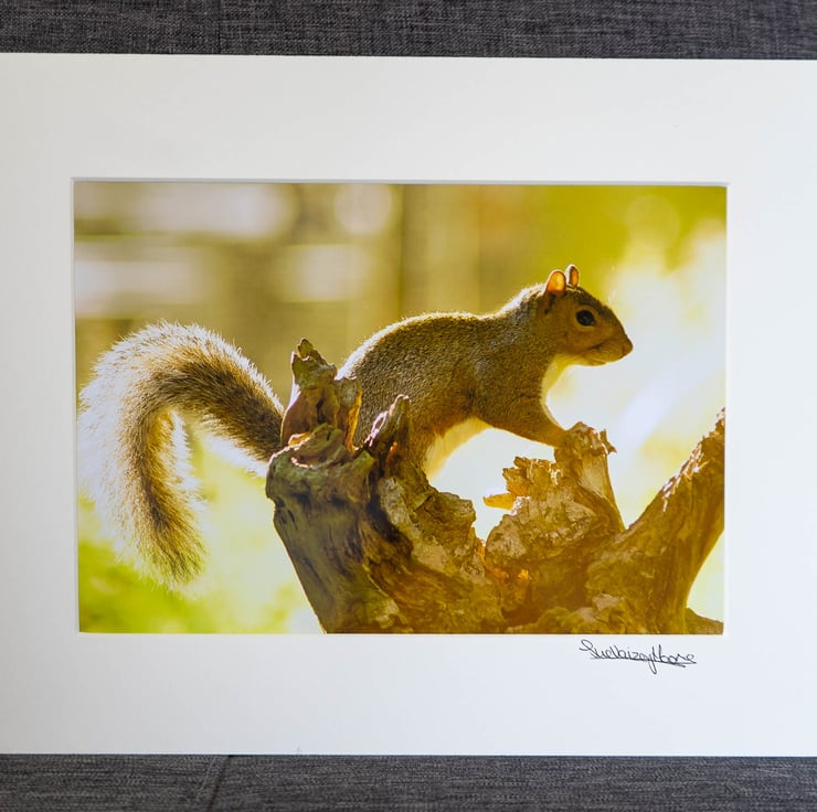 This limited edition, hand-signed, mounted A4 photo is called 'Squirrel in Sunshine'. I took the photo on 29.09.18 whilst sitting in a hide bird watching at Maple Lodge Nature Reserve in Hertfordshire. The squirrel ran along the front of the hide and then posed on the tree stump, bathed in sunshine.