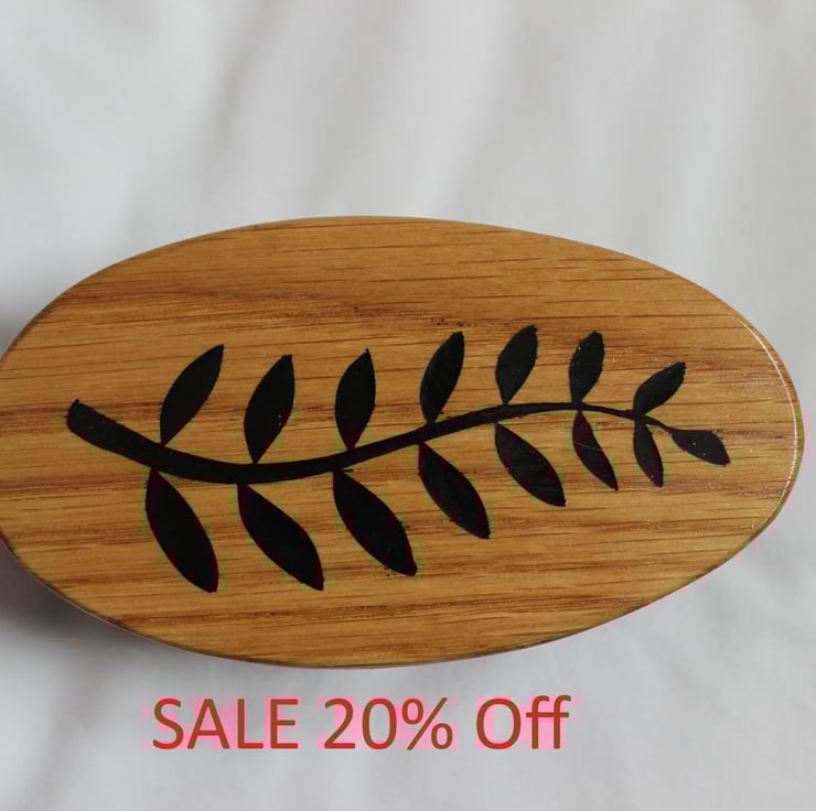 A beautiful solid oak wood jewellery / trinket box finished in a light satin sheen inlaid with a 'Fern leaf' pattern. The box internals finished in soft dark red flocking.
