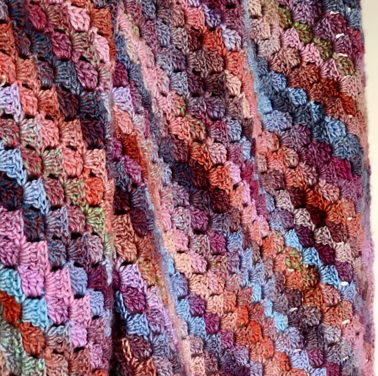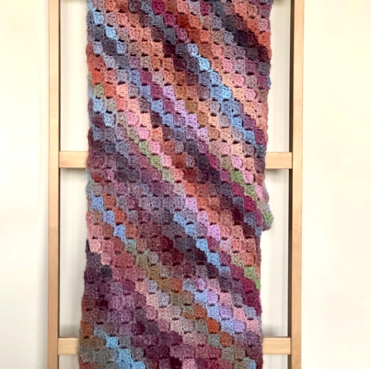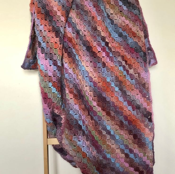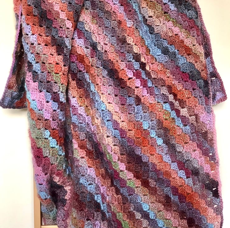 A beautiful soft blanket crocheted from a yarn with wonderfully warm colours. It is the perfect addition to a cosy bedroom or sofa.