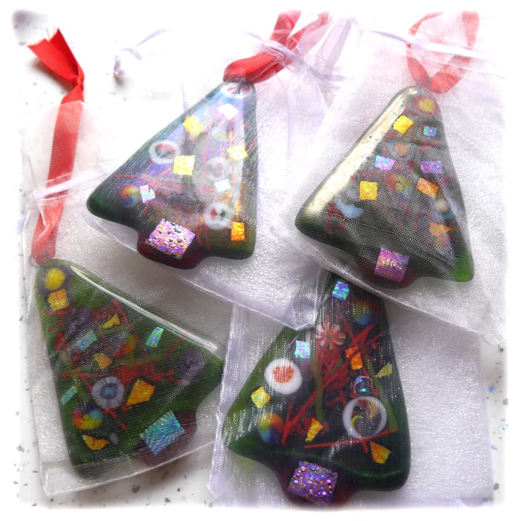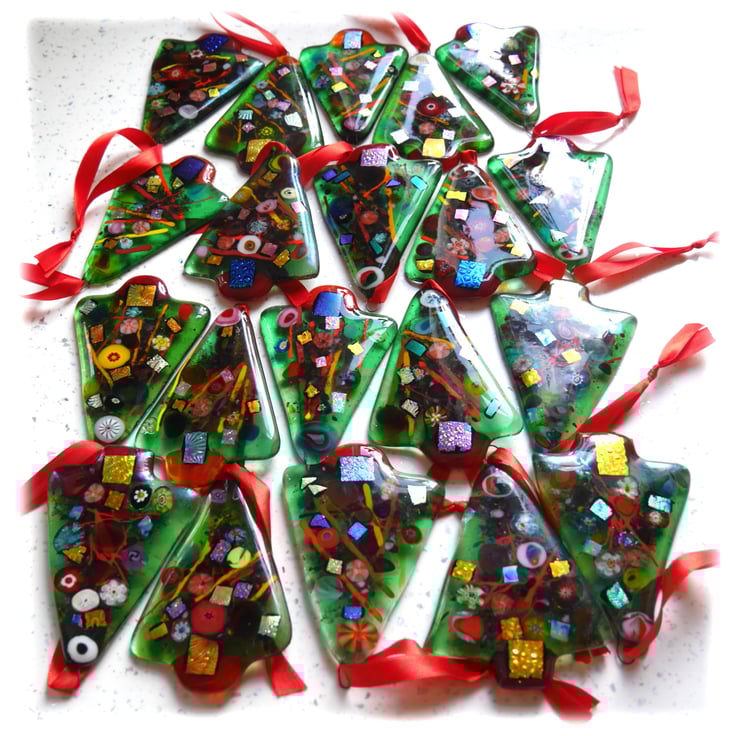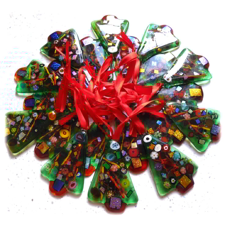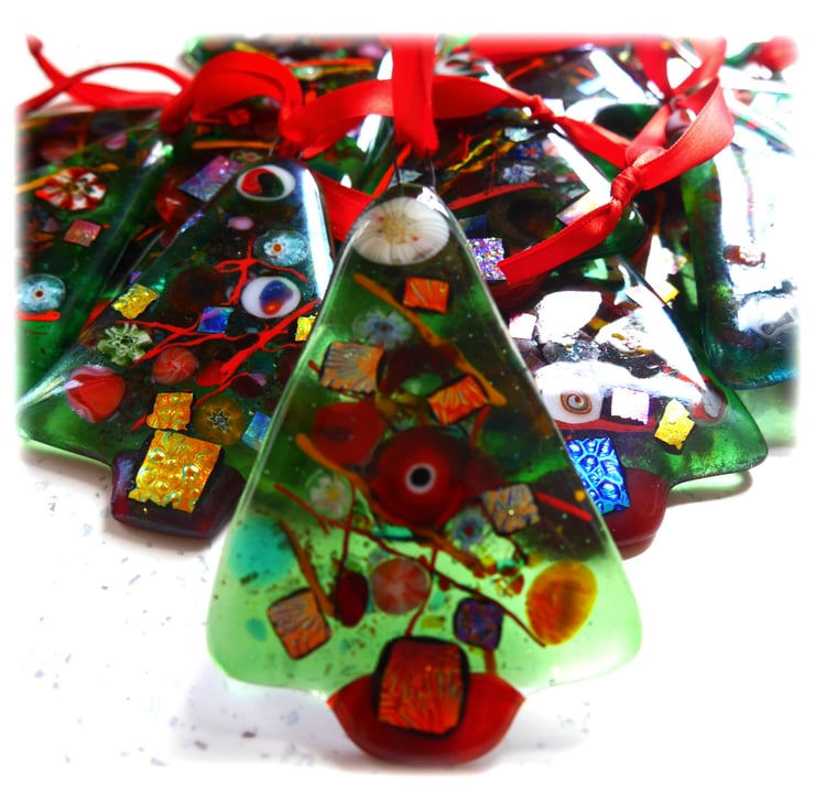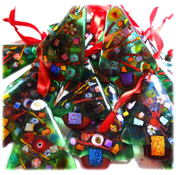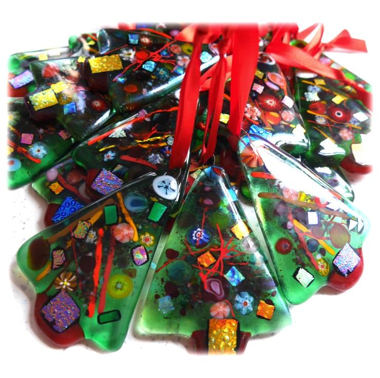 Each tree has layers of green glass which I've then decorated with lots of shimmery dichroic glass and coloured pieces to give the effect of baubles. The stand is bright red glass and they hang from matching red ribbon.