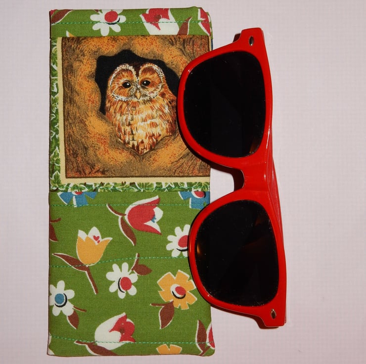This slip-in style glasses case features a small picture of an owl, with a different owl picture on the reverse, teamed with a contrasting print above and below, which is also used for the lining. It is made from cotton print fabrics with a layer of wadding for protection. This is a slip in style glasses case, if you require a case which fastens please view my other listings.