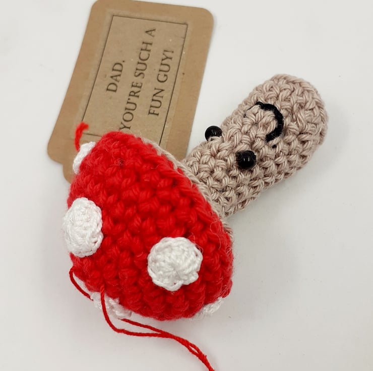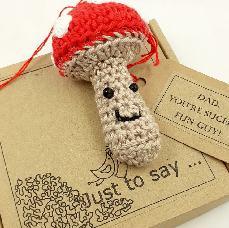 This cheerful toadstool is all set to deliver a message on your behalf and would make a novel keepsake alternative to a greetings card. It is crocheted and embroidered in cotton, filled with polyester stuffing and has glass beads for eyes. It has a tag attached which reads 'Dad, you are such a fun guy!' although I am very happy to exchange this tag for one with a message of your choice. It measures approximately 8 cm tall and comes nestled in tissue paper in a labelled PIP ( Postage in Proportion box, all ready to be given or posted on.