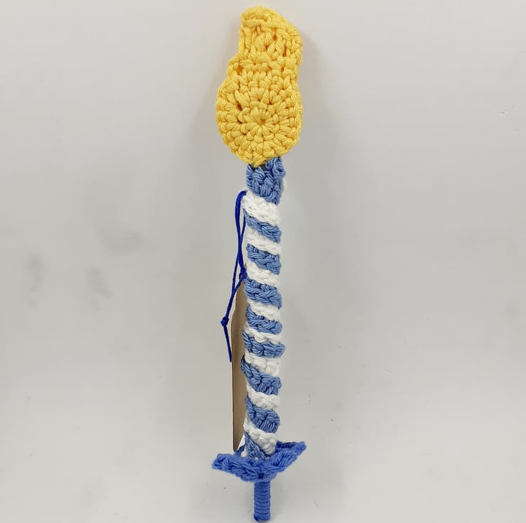 A novel way to wish someone a happy birthday, this candle has been crocheted in cotton around a cardboard lolly stick. It measures approximately 18cm from the top of the cheerful flame to the base of the candle holder. The tag is currently blank so that I can add a message of your choice.