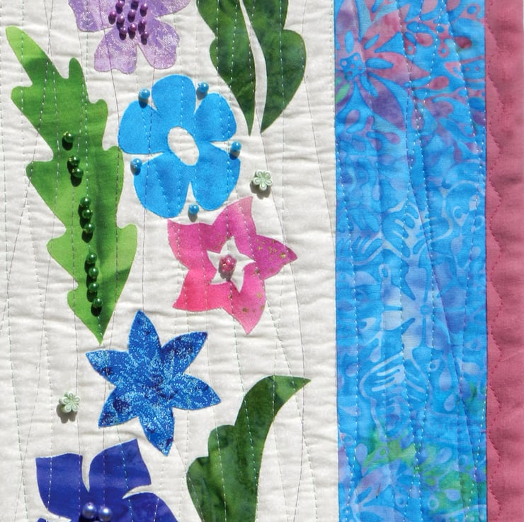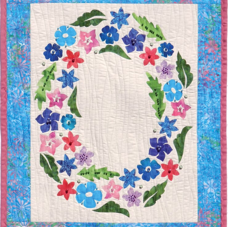 I chose a subtle cream-on-cream floral print for the background, and arranged the shapes in an oval garland. Next, I added borders in a multicoloured floral batik, then I quilted by machine across the whole design in long, sinuous lines, using a slightly shiny variegated thread in pale pastels.