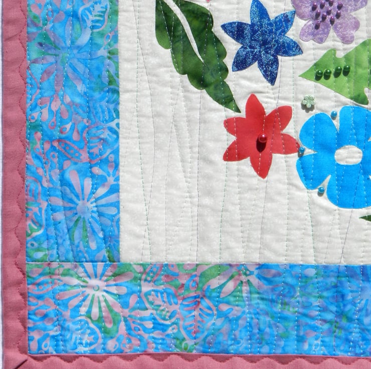 The quilt is backed in plain coral pink, and the edges are bound in plain pink, caught down with a decorative wavy machine stitch. A few green flower-shaped beads complete the embellishment.