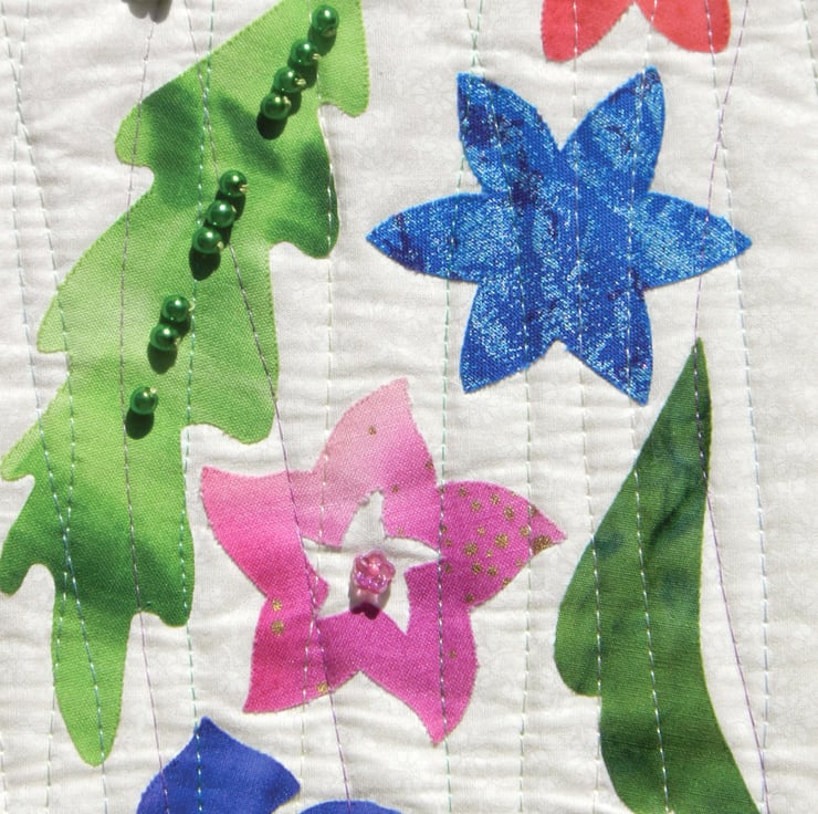 The blossoms are in shades of turquoise, purple, mauve and pink, set off by apple-green leaves, and I've used lots of marbled and batik fabrics to create naturalistic shading. Several of the fabrics have touches of silver of gold overprinting, and lots of shiny beads in toning colours also catch the light.
