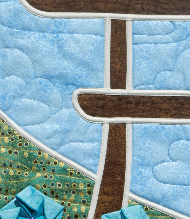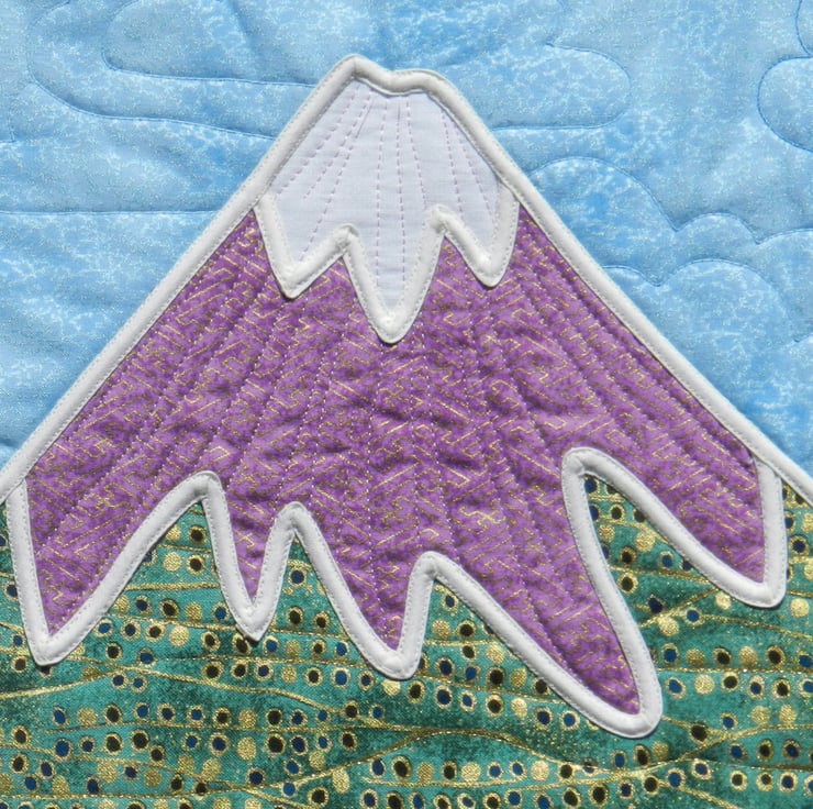 Lines of machine quilting create clouds in the sky, and ripples in the water, and texture on the mountain, the boat, and the waterlily pads. Gleaming beads catch the light on the water, and also create decorative centres for the flowers.