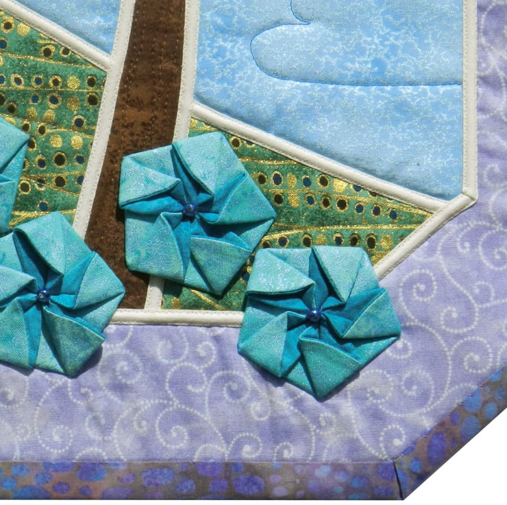 The panels are created in stained glass patchwork using pale cream bias binding, and each panel is decorated with a different style of folded fabric flowers. Lots of the fabrics have a slight metallic overprinting, which gives them an exotic sheen.