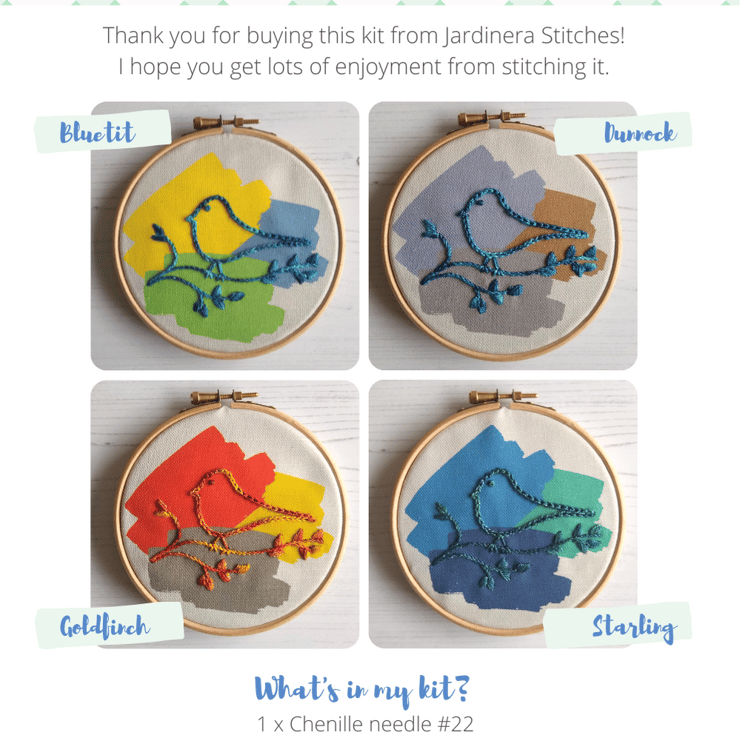 These little garden birds are inspired by the beautiful wonders that hop around my garden. I'm extremely lucky to have sparrows, starlings, robins, blackbirds, blue tits, great tits, goldfinches, dunnocks, and occasionally fieldfares and redwings. They have some amazing colours in their feathers which I've picked out in each kit.