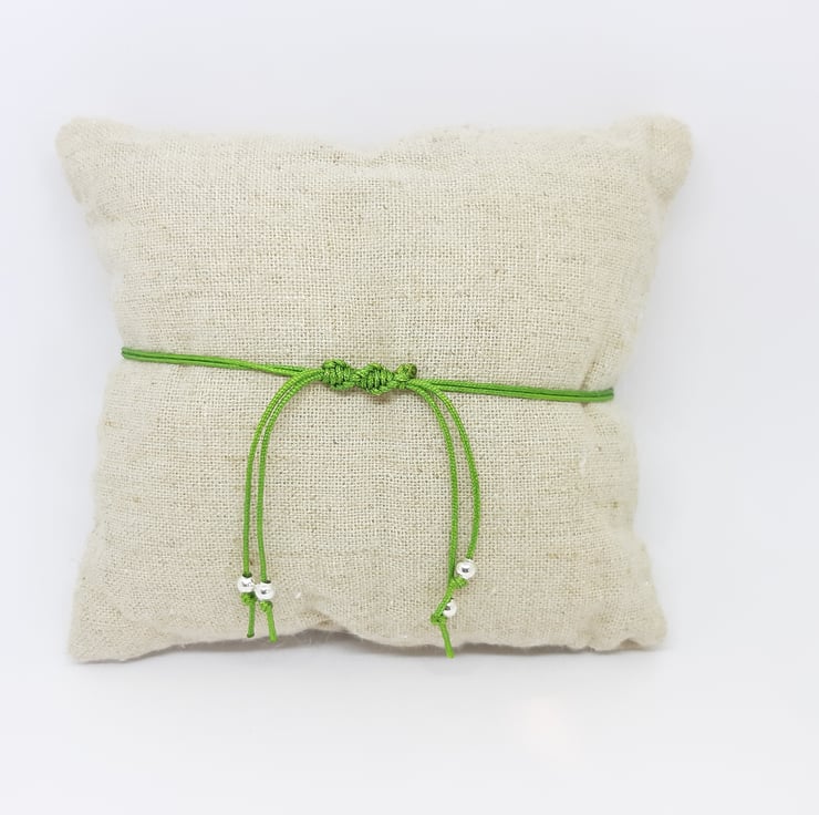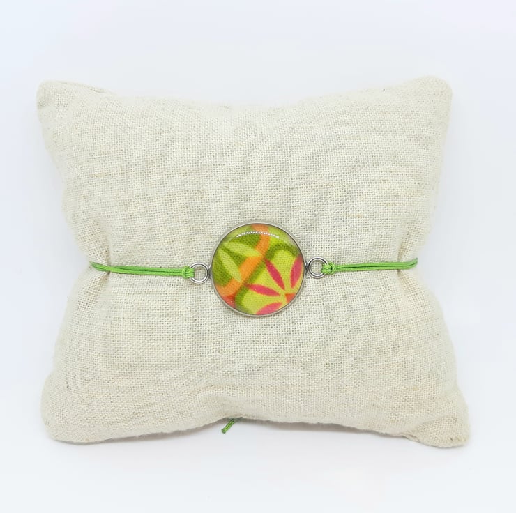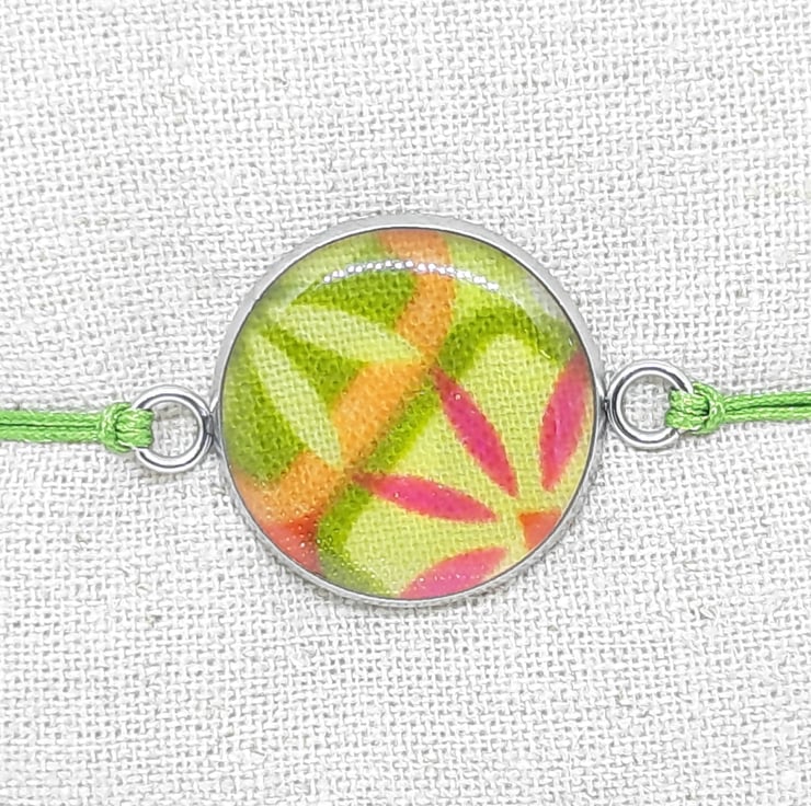 Handmade fabric and resin pendant with adjustable cord bracelet - green floral design.