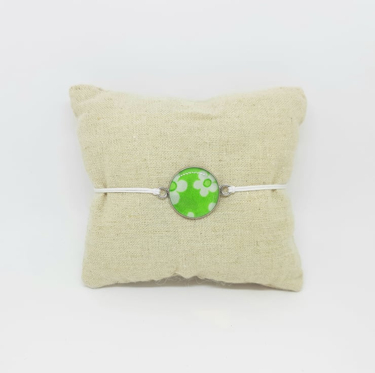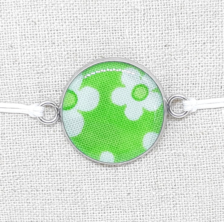 Handmade fabric and resin pendant with adjustable cord bracelet - green floral design.