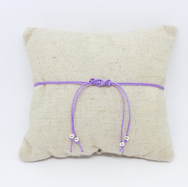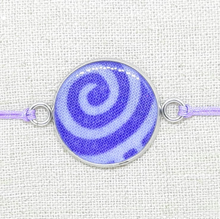 Handmade fabric and resin pendant with adjustable cord bracelet - purple swirl design.