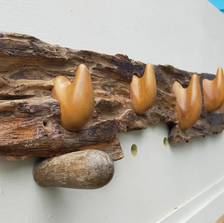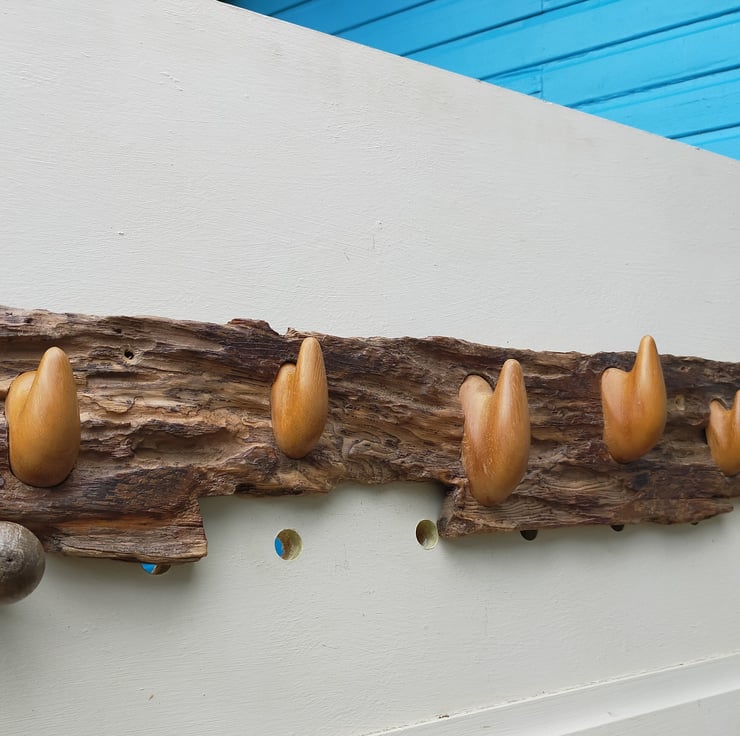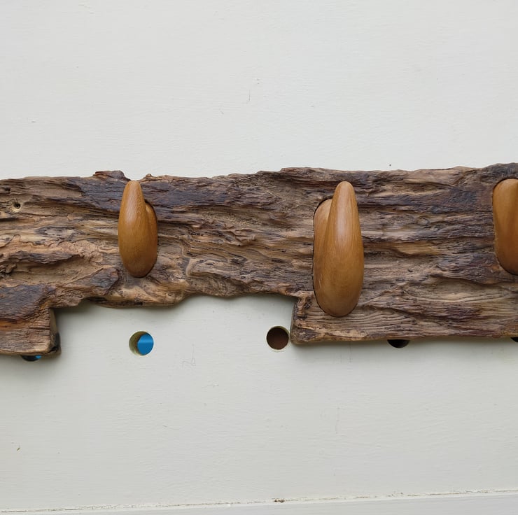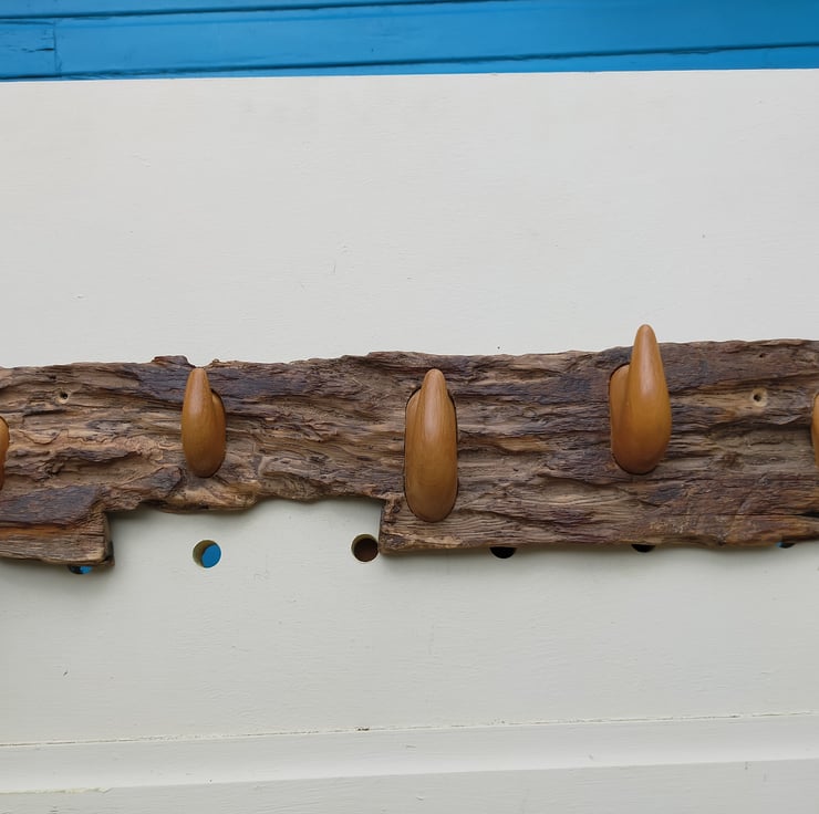 Just to the north of Anthony Gormley's sculptures on Crosby beach is what locals know as the Brick Beach. Here, the rubble of the Blitz on Liverpool was deposited to act as a defence against coastal erosion. For many years I have walked that beach, picking up curiously gnarled pieces of timber. At first I thought they were driftwood, etched into sculptural shapes by the sea, but I came to realise that they were being revealed by the wind and sea from the war rubble I was walking on. It dawned on me that these weren't just bits of wood, these wormeaten pieces of door frame and floorboard, some showing the marks of fire, were part of the history of my home town. I decided to give these beautiful historical remnants of the bombed homes of past Liverpudlians a new lease of life as coat racks. Each has been dried, cleaned up (but not too much), planed flat at the back, treated with preservative, and adorned with hand carved hooks from other reclaimed hardwoods. A piece of Liverpool's history and a functional piece of art in its own right, this wonderfully gnarly piece was originally a floorboard: you can just make out the tongue-and-groove at each end and clearly it has had a section cut out to accommodate some feature of the building, which all adds to its character in my eyes. Into it I have screwed, glued and embedded five very chunky hooks of varying sizes, individually hand carved from reclaimed Brazilian mahogany. Waxed finish, L 850 mm x H 150 mm x D 70 mm.