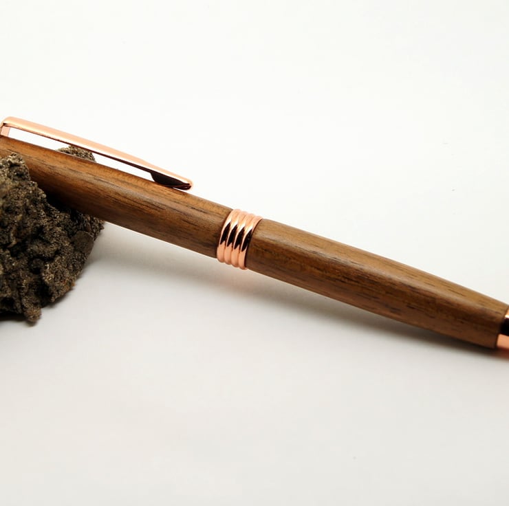 This pen was handturned by me in my workshop in suffolk, the metal parts are copper finish, Included in the price is a black card presentation box & Protective velvet sleeve