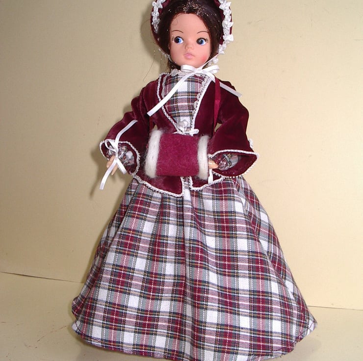 This pattern is for a Victorian costume 1850 to fit an 11-12" fashion doll. Patterns are included for dress, jacket , bonnet , muff and full underwear. The instructions include a list of materials needed and full instructions with diagrams. The pattern pieces are printed on thin card so that they can be cut out and used as templates.