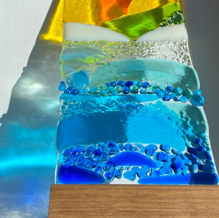 Lots of colour and texture feature in this glass panel with elements of sea, land and sunset sky.