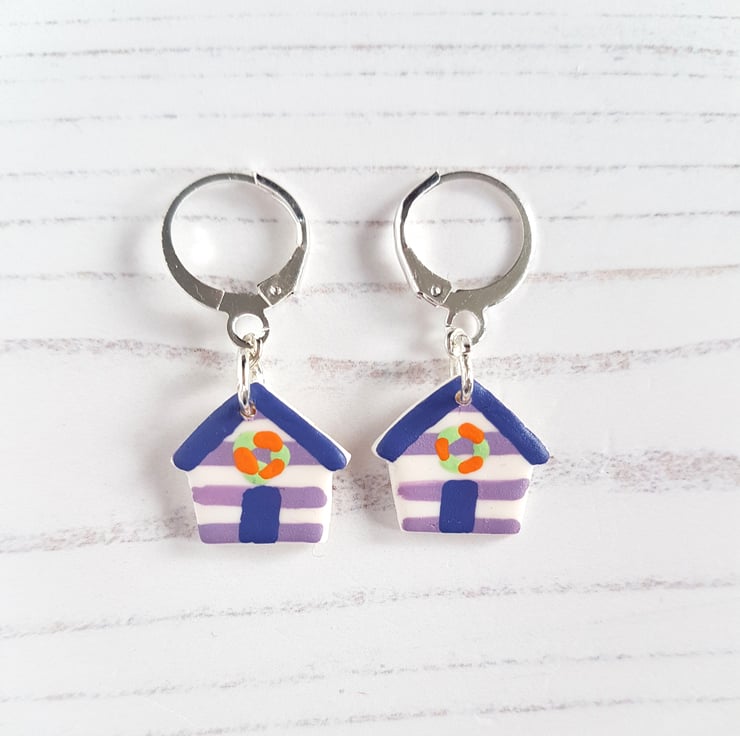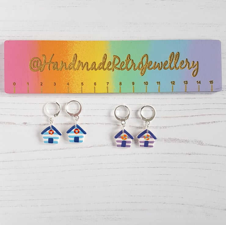 These gorgeous quirky little beach hut huggie hoop earrings have been carefully hand crafted using polymer clay, with detail painted using acrylic paint. They are then sealed with a gloss to protect and finish.