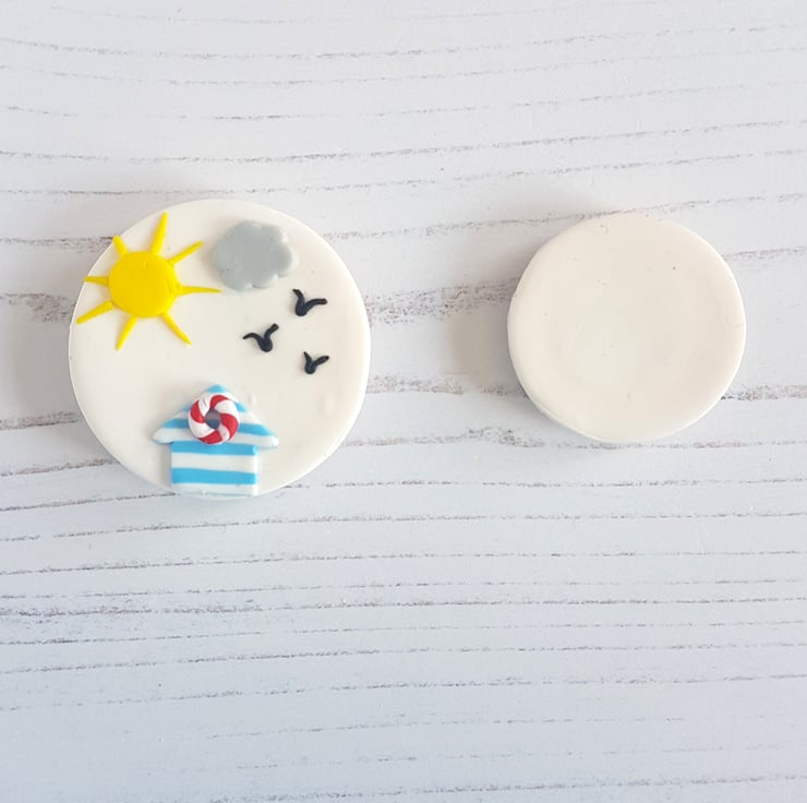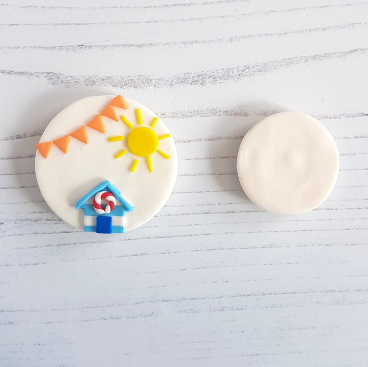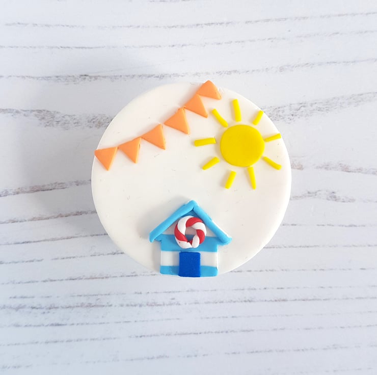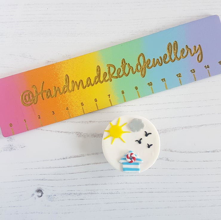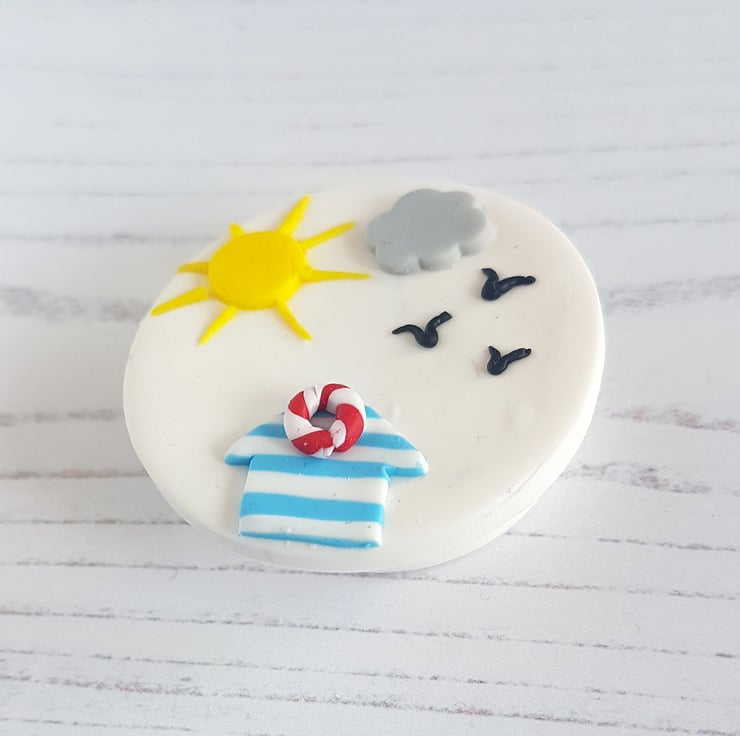 This gorgeous seaside themed needle minder is hand made by myself using polymer clay, with a white disc base, and features a selection of seaside themed icons on the top, including a beach hut, bunting and sunshine.