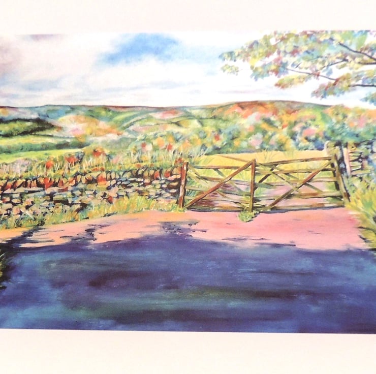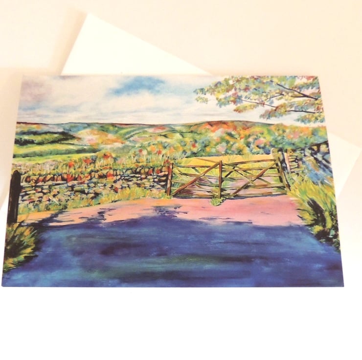 Rectangle A6 fine art greeting card produced from an image taken from my own original oil painting of a sublime landscape looking across summer fields over a gate.