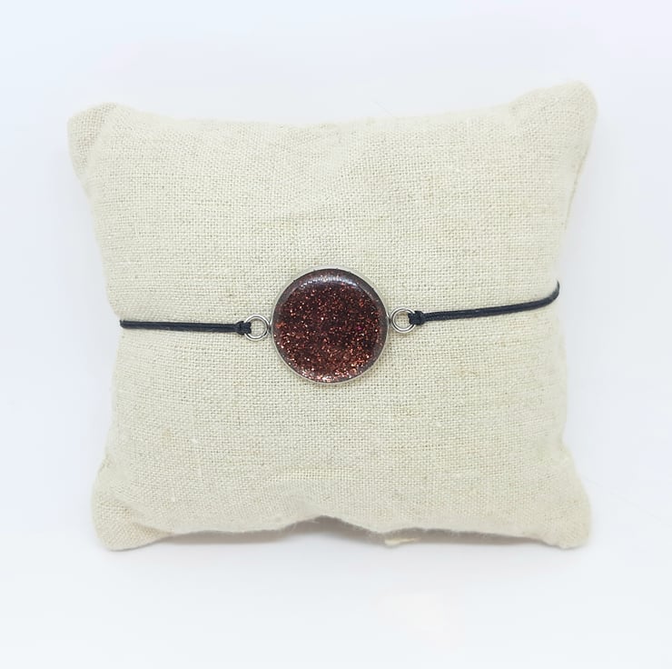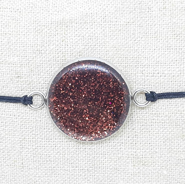 Handmade, glitter resin pendant with adjustable cord bracelet - bronze. Pendant size approximately 20mm.