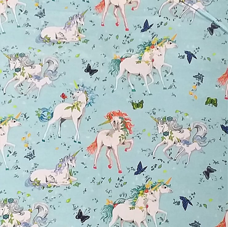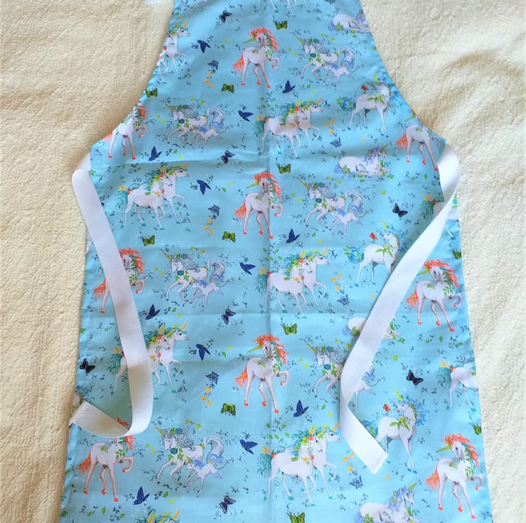 This is a lovely pale blue cotton apron which will fit an older child, from about 8 to a small adult. It is decorated with beautiful white unicorns, colourful butterflies and flowers. The unicorns may appear in different places from the ones in the photo. I have made it of a good quality machine washable cotton, with acrylic webbing straps. It measures approximately 27" (70cm.) from neck to hem, and 18" (46cm.) at the widest point, (The girl wearing a different apron of the same size is thirteen years old.)