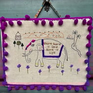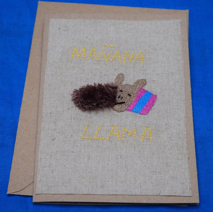 This dozy llama is fast asleep on her colourful cushion without a care in the world. Everything can wait until tomorrow! The llama has been hand embroidered on a light canvas and mounted on a brown greetings card 4" x 6". The inside of the card has been left blank for your own message.