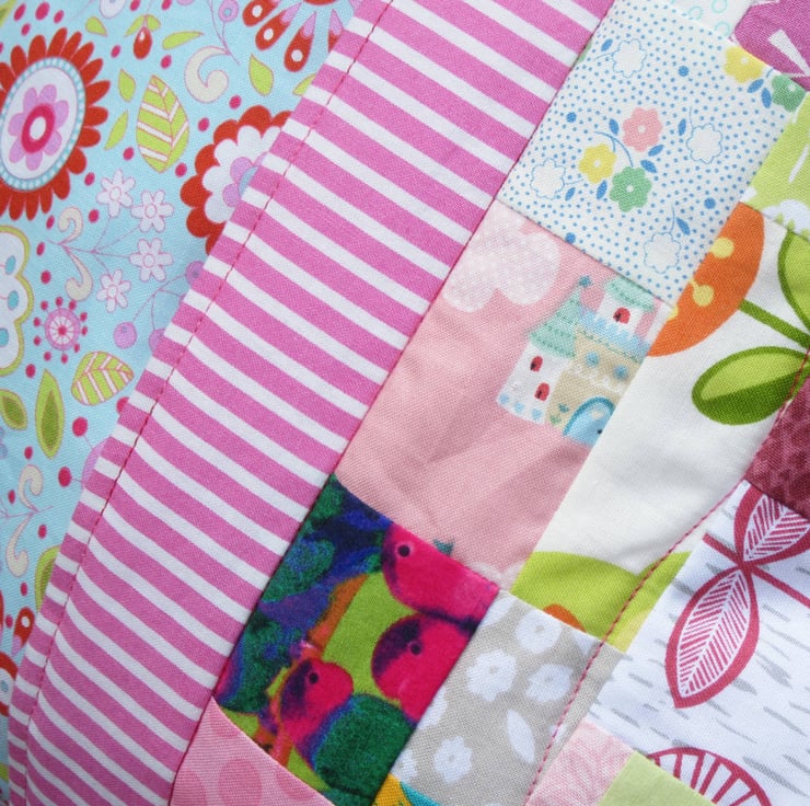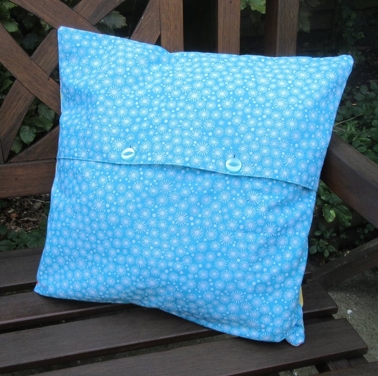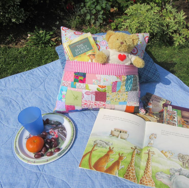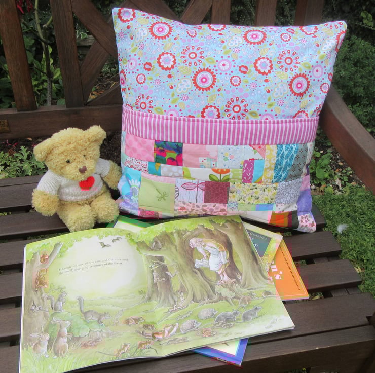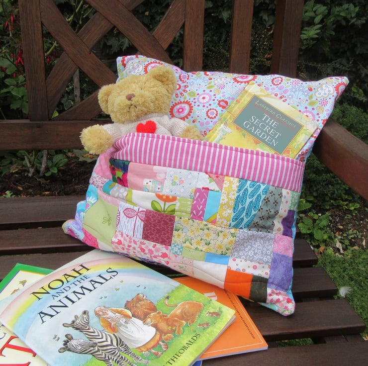 Bright and colourful cushion cover with lined patchwork pocket. Ideal for storing favourite books and toys. This style of cushion cover, also called a 'book pillow', is a great way to encourage a love of books and reading. As well as a place to store a current favourite book (and maybe a cuddly toy or two) the cushion also provides a comfortable place to read, indoors or out.