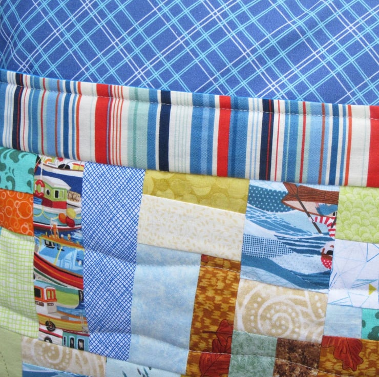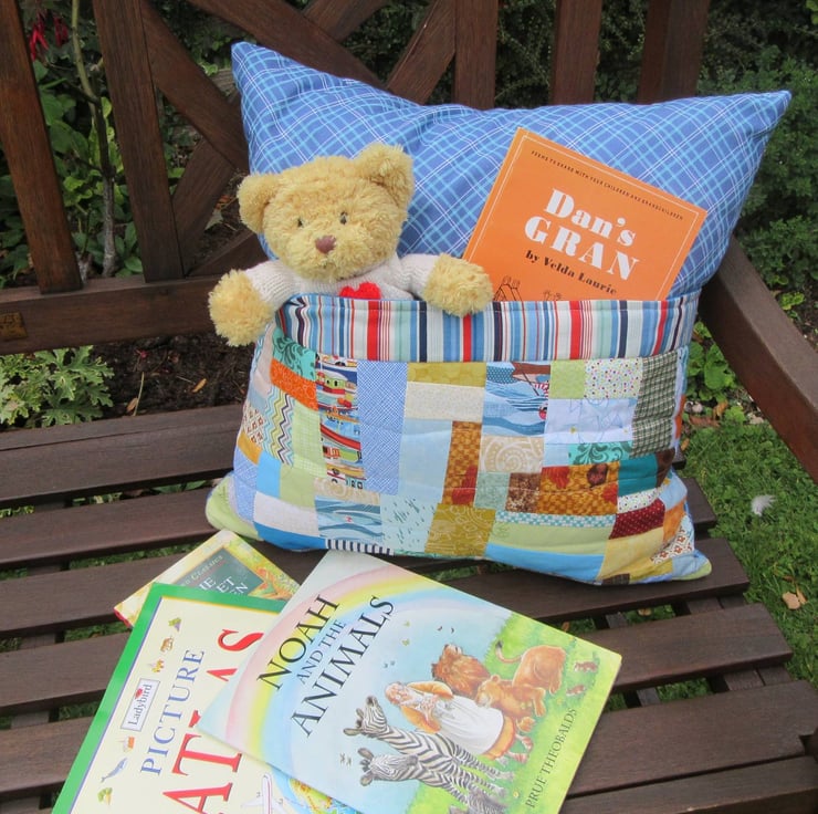 Cushion cover with lined patchwork pocket. Ideal for storing favourite books and toys. A great way to keep current books and toys safe and ready to use. The cushion can be carried around, indoors and out - ready to provide a comfortable place to rest and read.