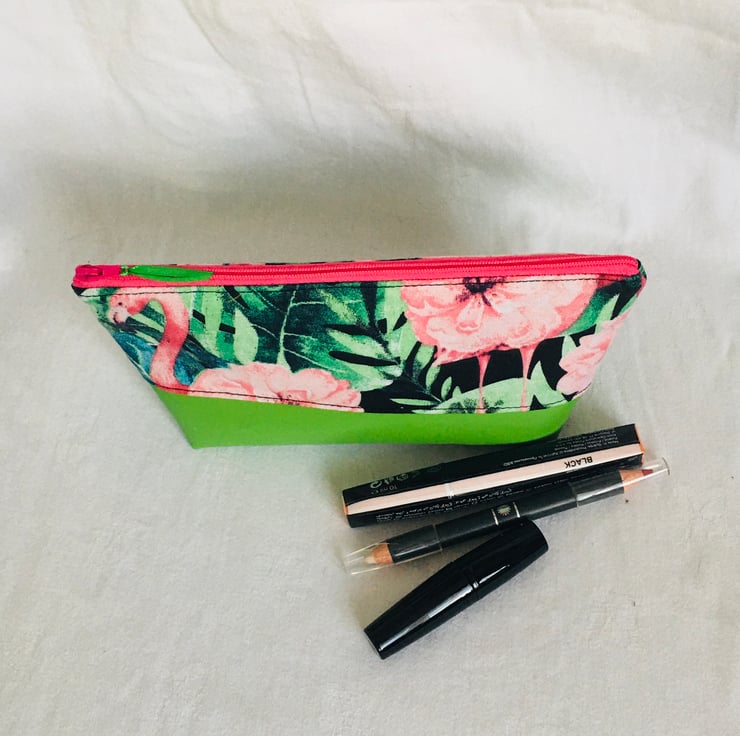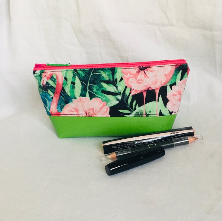 This bag has been made from high quality cotton fabric with Tropical floral and leaf print on Black background on the outside at the top, and a Bright Green faux leather at the base and finished with waterproof lining for ease to wipe clean. Finished with full zip closure across the top. A real unique, one of a kind and stunning looking cosmetic bag.