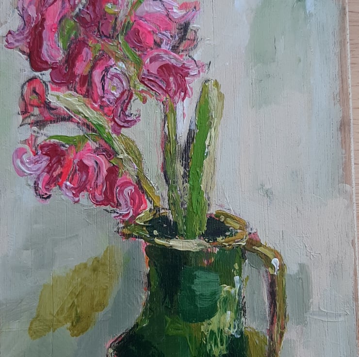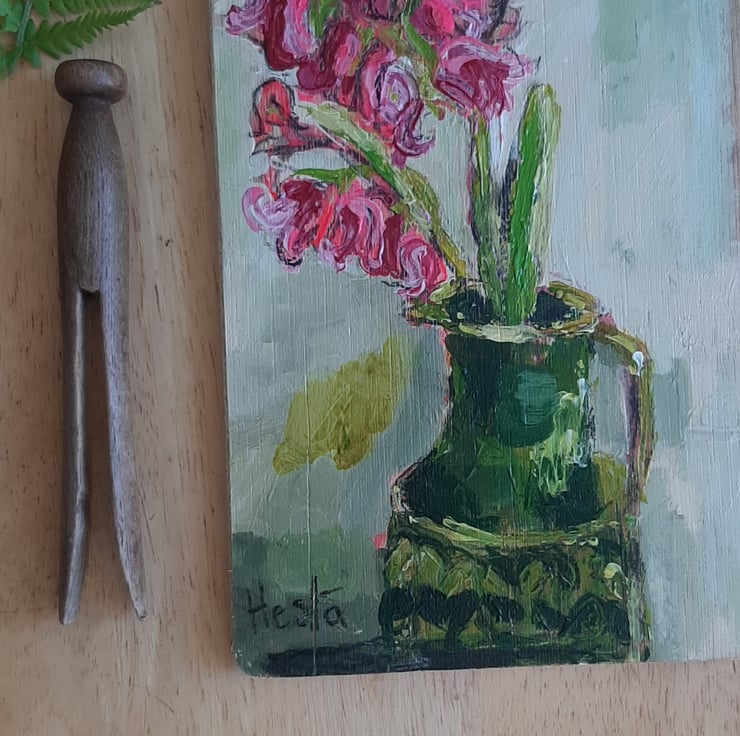 A contemporary, confident still life in pinks and greens by artist hesta singlewood aka bodkincreates. Painted on reclaimed wood 20 cm tall 12cm wide..signed, varnish and ready to hang. Beautiful pink hyacinths which are painted with rich texture .