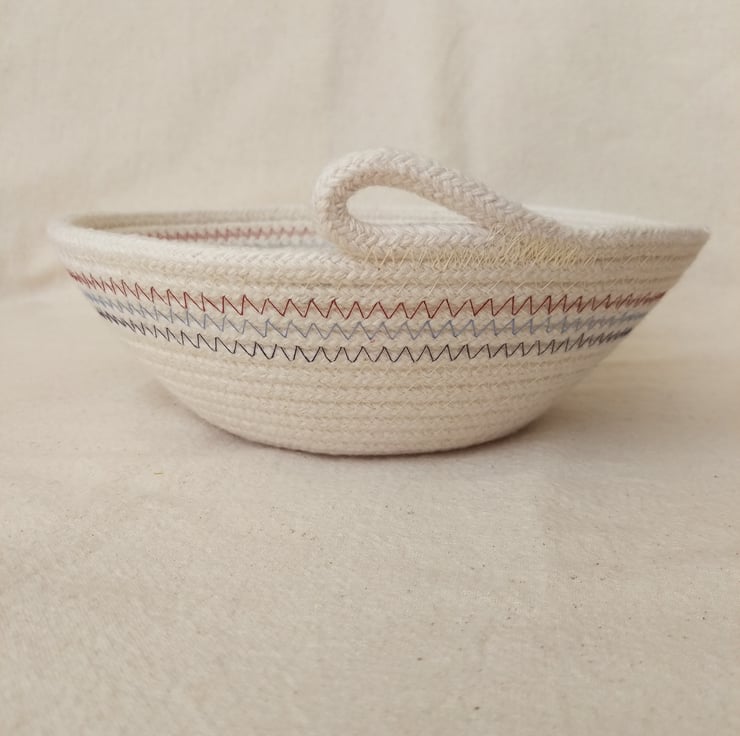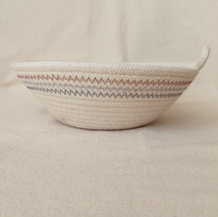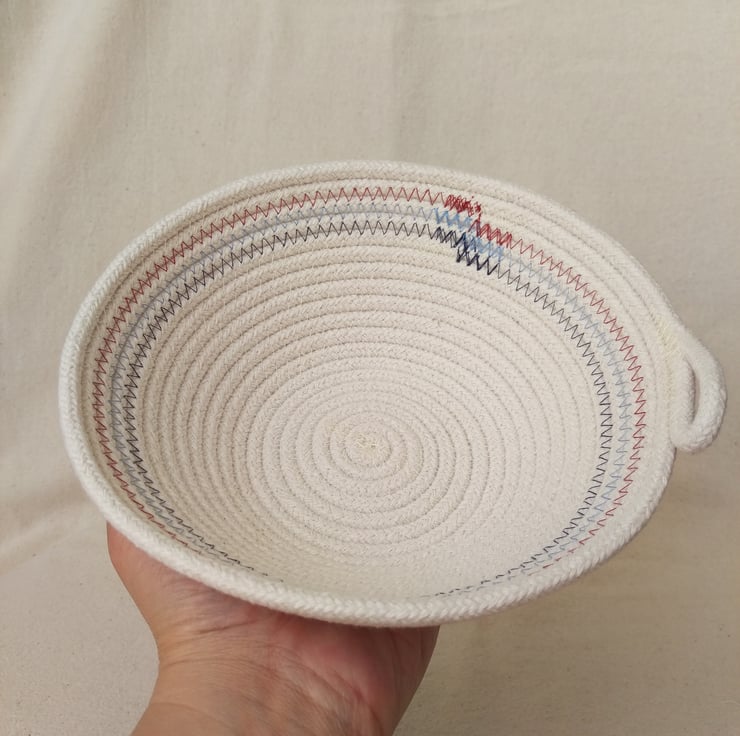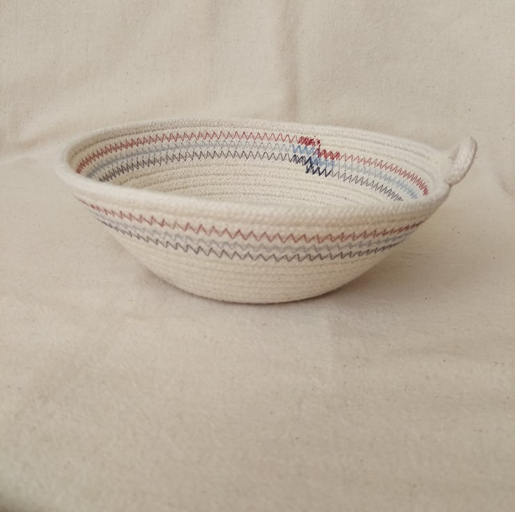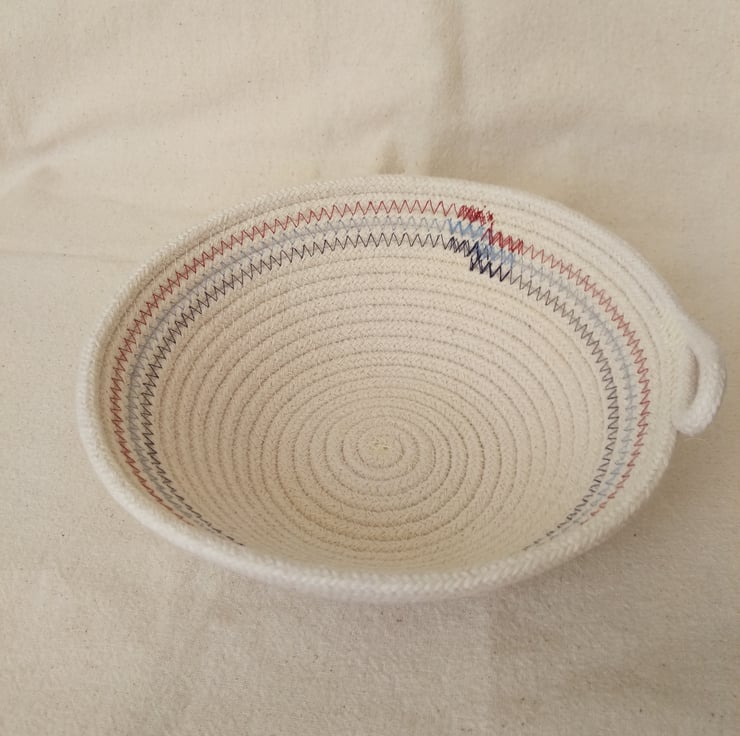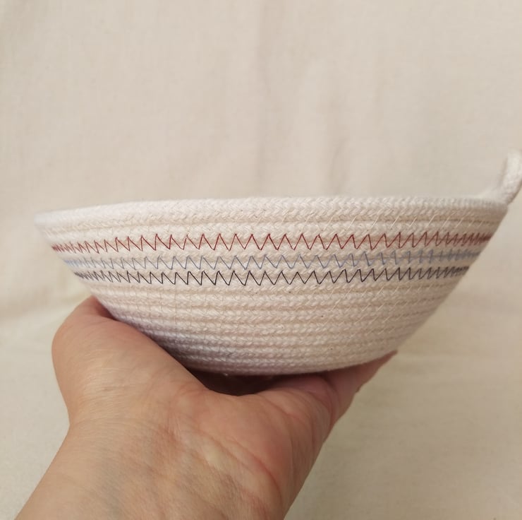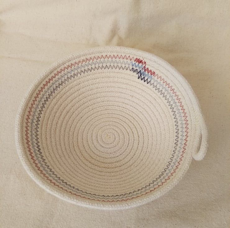 A spiral of unbleached cotton rope has been machine stitched to form this simple Afton Bowl. It has been finished with stitched detail in rust, sky blue and dark grey threads
